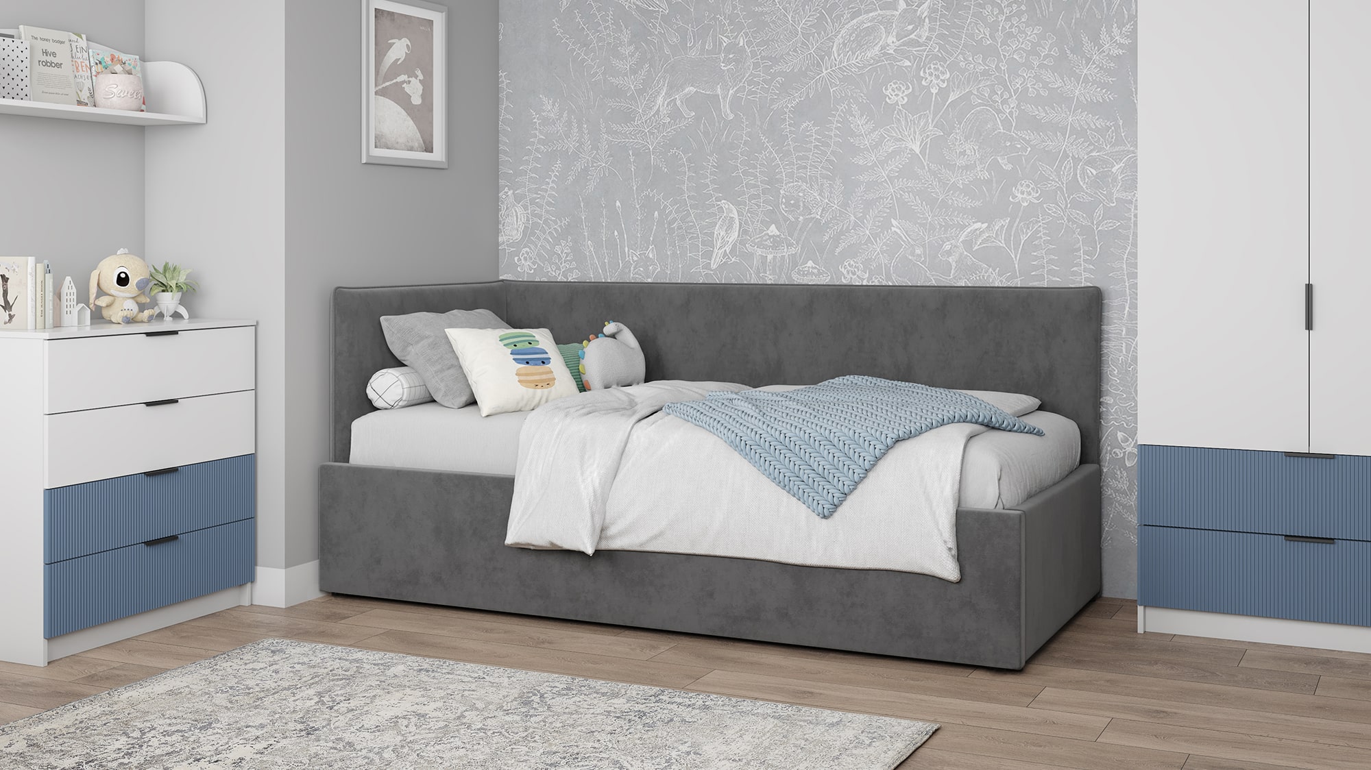 Обивка выполнена из высококачественного велюра, который выдерживает более 70 000+ циклов истиранияи легко очищается, что делает кровать лёгкой в уходе и идеально подходящей для детской комнаты. Внутренняя обивка из файбертекса обеспечивает дополнительный комфорт.