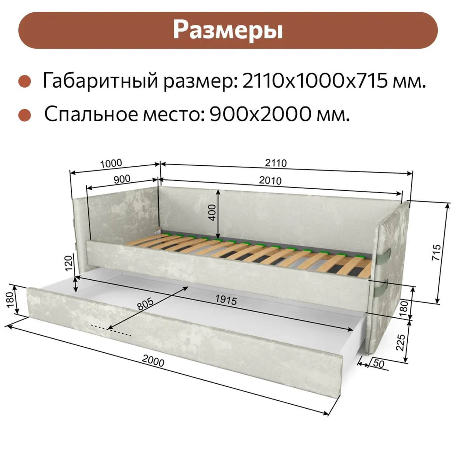 Размер дополнительного спального места: 1900*900 мм.