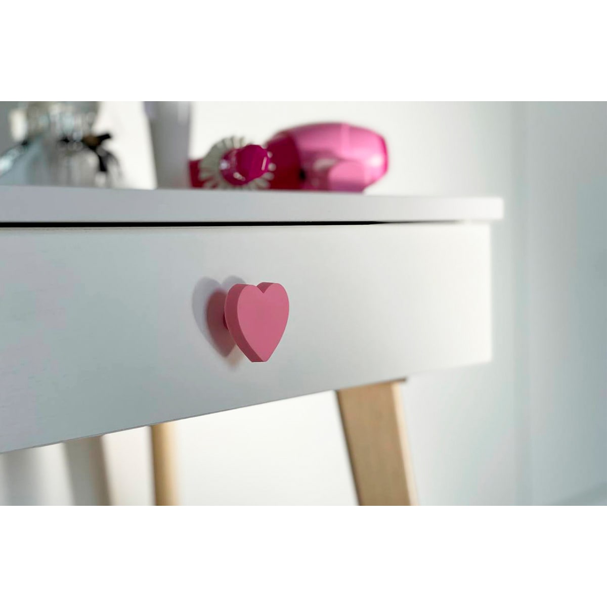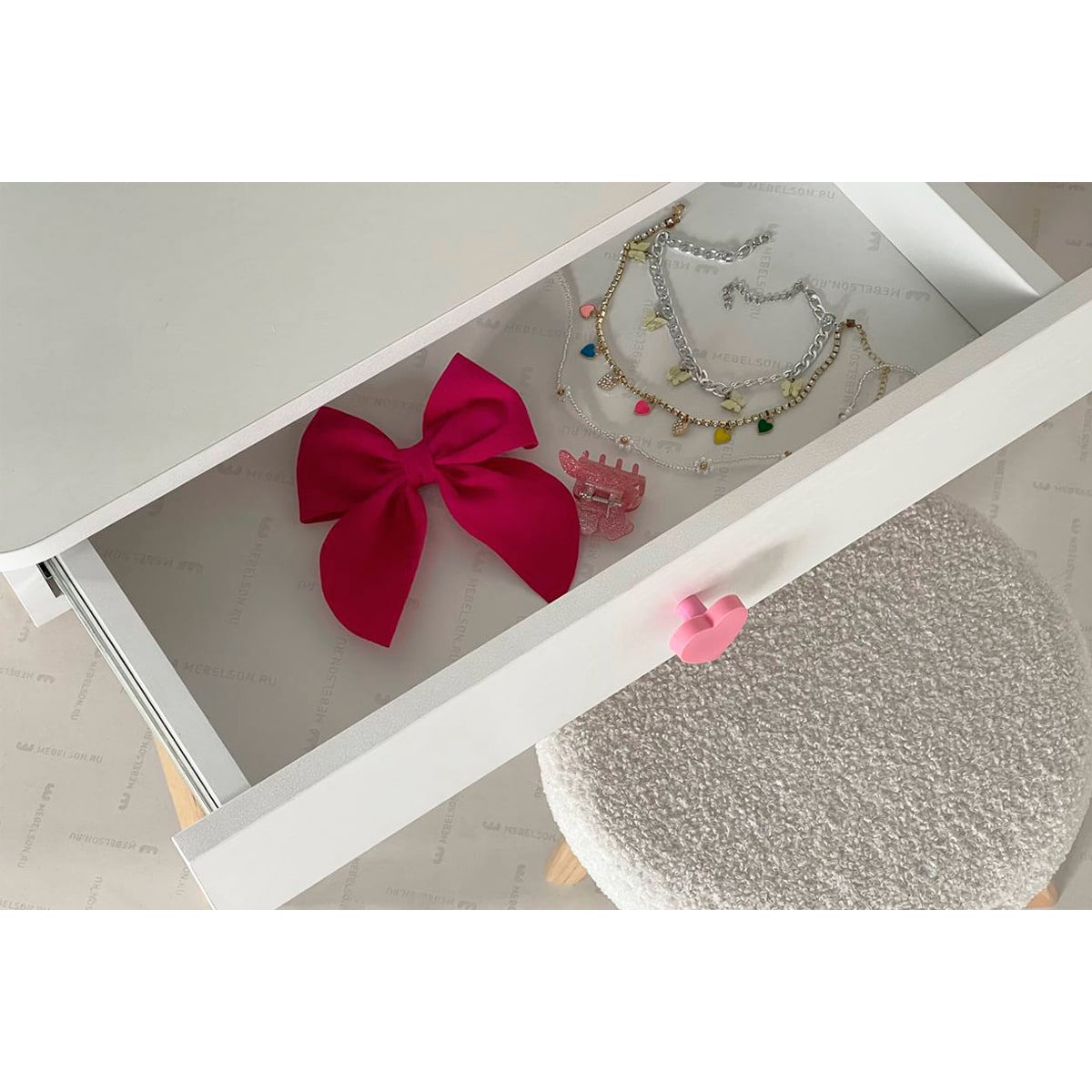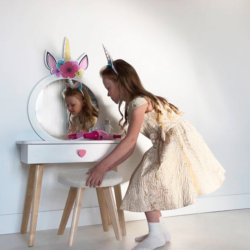 Создайте волшебный уголок для вашей дочери с этим прекрасным набором. Трюмо с ярким зеркалом и выдвижным ящиком с ручкой в форме сердечка идеально подойдет для хранения всех любимых аксессуаров. Прочная столешница предлагает много пространства для рисования и других творческих занятий. Деревянные ножки со специальными фетровыми подпятниками гарантируют безопасность пола, а плюшевый чехол комфорт при сидении.
