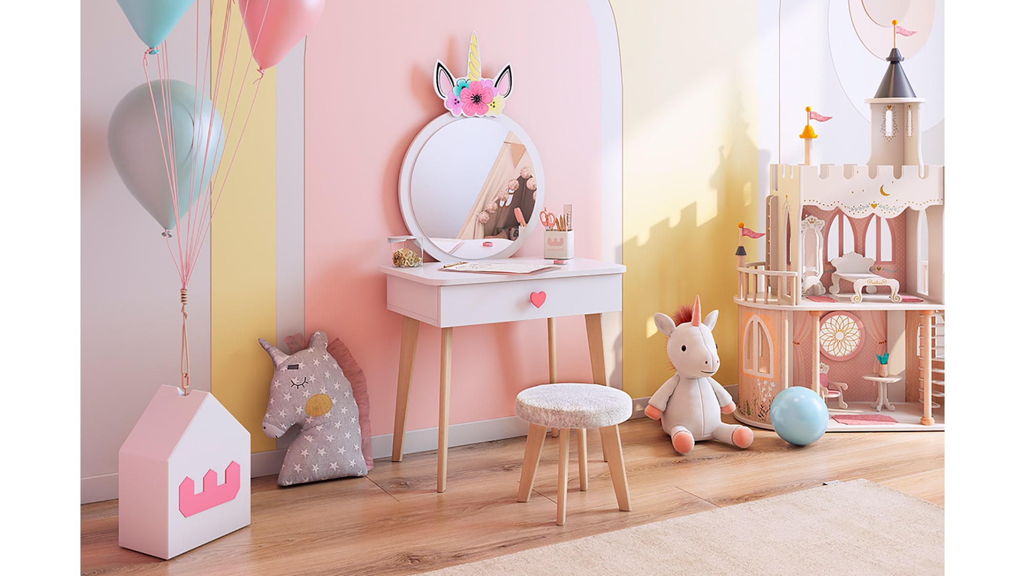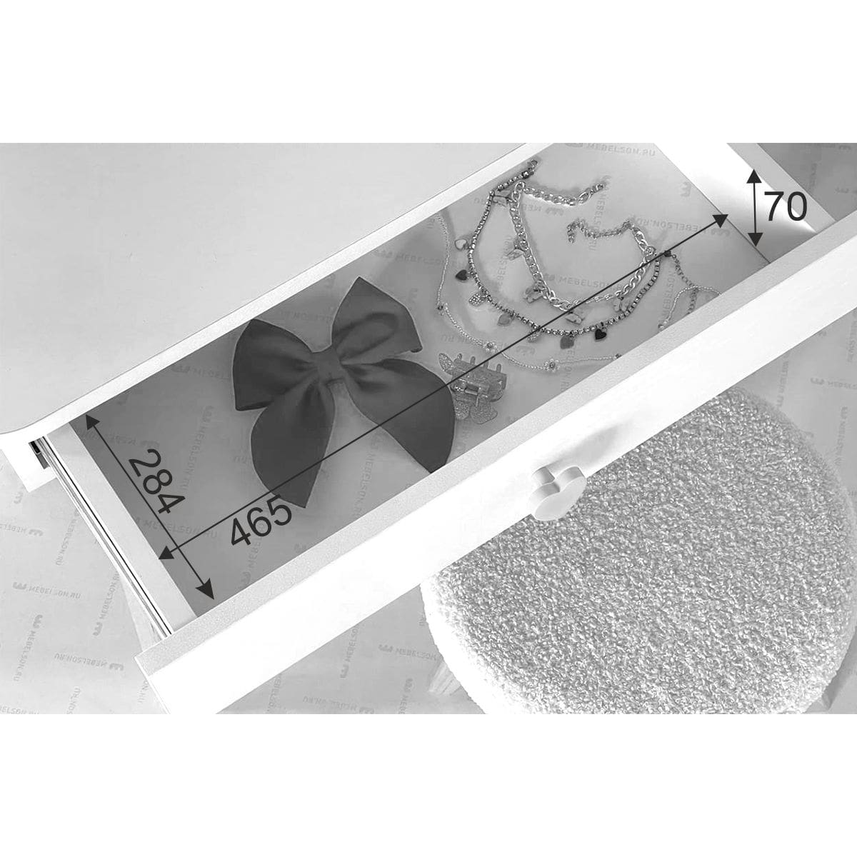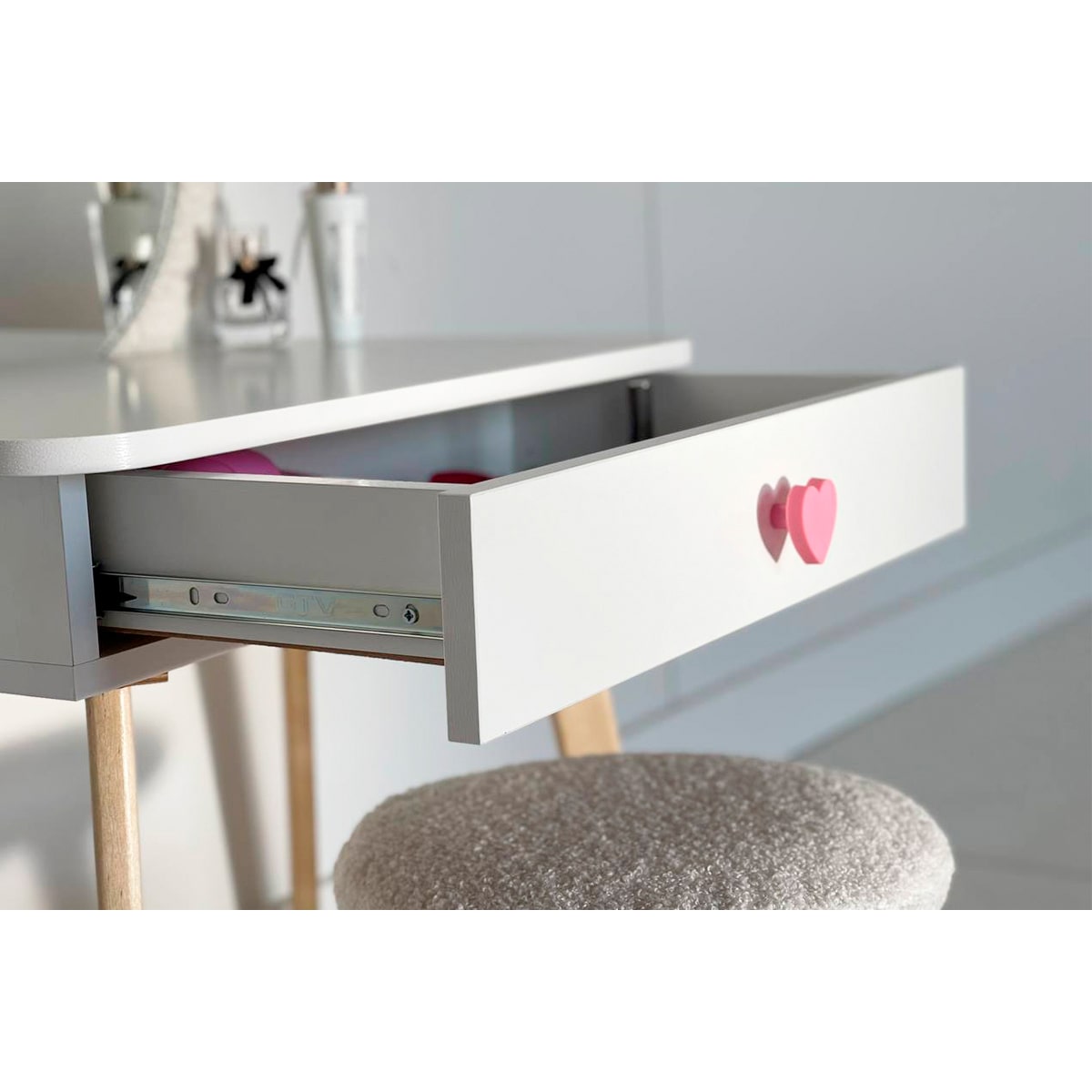 Создайте волшебный уголок для вашей дочери с этим прекрасным набором. Трюмо с ярким зеркалом и выдвижным ящиком с ручкой в форме сердечка идеально подойдет для хранения всех любимых аксессуаров. Прочная столешница предлагает много пространства для рисования и других творческих занятий. Деревянные ножки со специальными фетровыми подпятниками гарантируют безопасность пола, а плюшевый чехол комфорт при сидении.