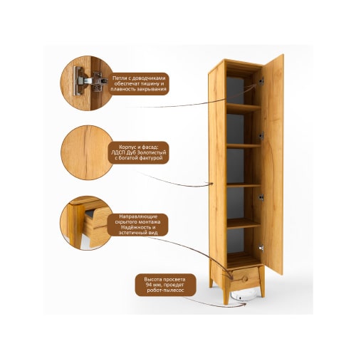 Петли с доводчиками обеспечивают тишину и плавность закрывания. Высота просвета 94 мм - робот-пылесос проедет свободно.