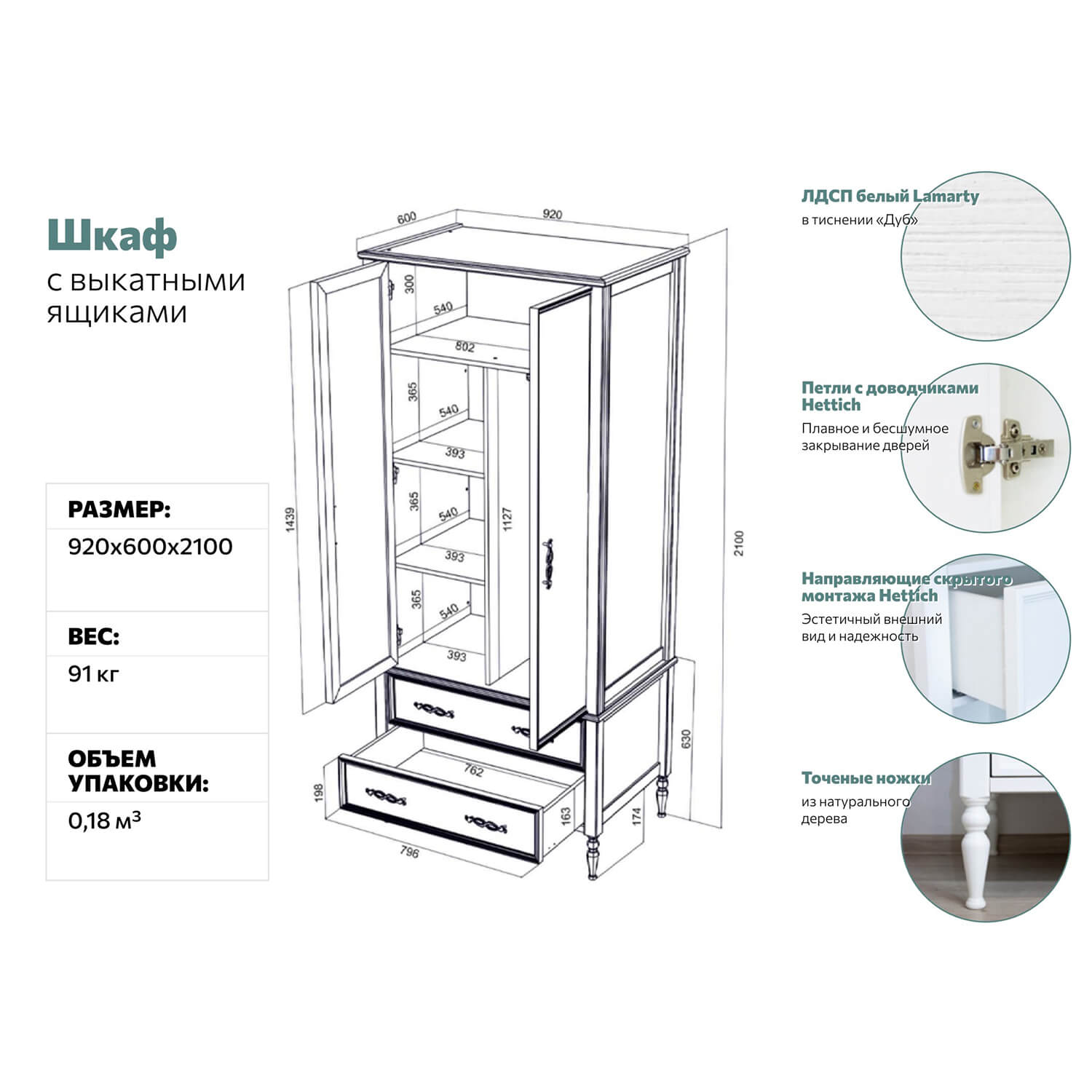 Корпус ЛДСП 16 мм. Опоры: массив березы Фасады: рамочные. Рамка - МДФ в пленке, вставка - ЛДСП 10 мм. Фурнитура: Ручка-скоба металлическая Направляющие шариковые полного выдвижения.