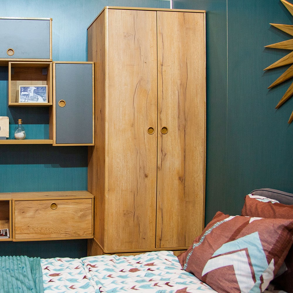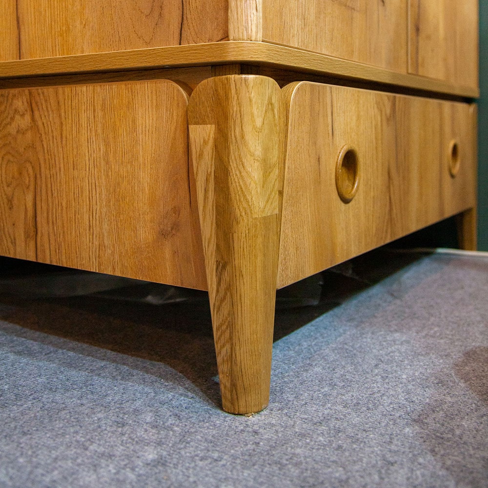 Шкаф двухстворчатый с выкатным ящиком. Корпус: ЛДСП 16 мм. Ручки: врезные, выточенные из массива дуба. Боковые закругленные декоративные накладки из массива дуба. Опоры: массив дуба Направляющие скрытого монтажа. Цвет: дуб золотистый.