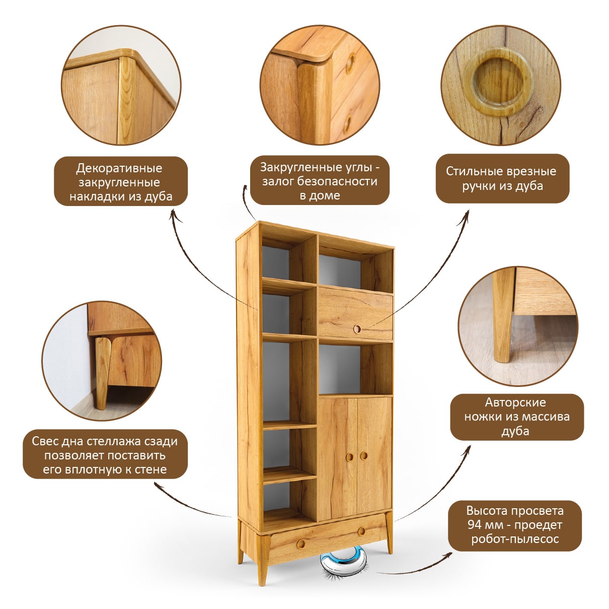 Широкий стеллаж с выкатным ящиком, предназначен для хранения одежды, белья, книг, игрушек.
