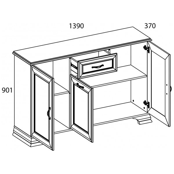 Элемент прекрасно оформит интерьер гостиной, столовой, также спальни. Тумба 3D1S может сочетаться с зеркалом 130, и организовать Стол туалетный в спальне. Тумба Тиффани 3D1S – прямая. Конструкция элемента представляет собой три отделения с полками из ЛДСП за глухими дверями (3D) для хранения предметов одежды, белья, скатертей, салфеток, посуды и других предметов быта, а также один выдвижной ящик (1S). Двери распашные, крепятся на петли к боковому корпусу.
