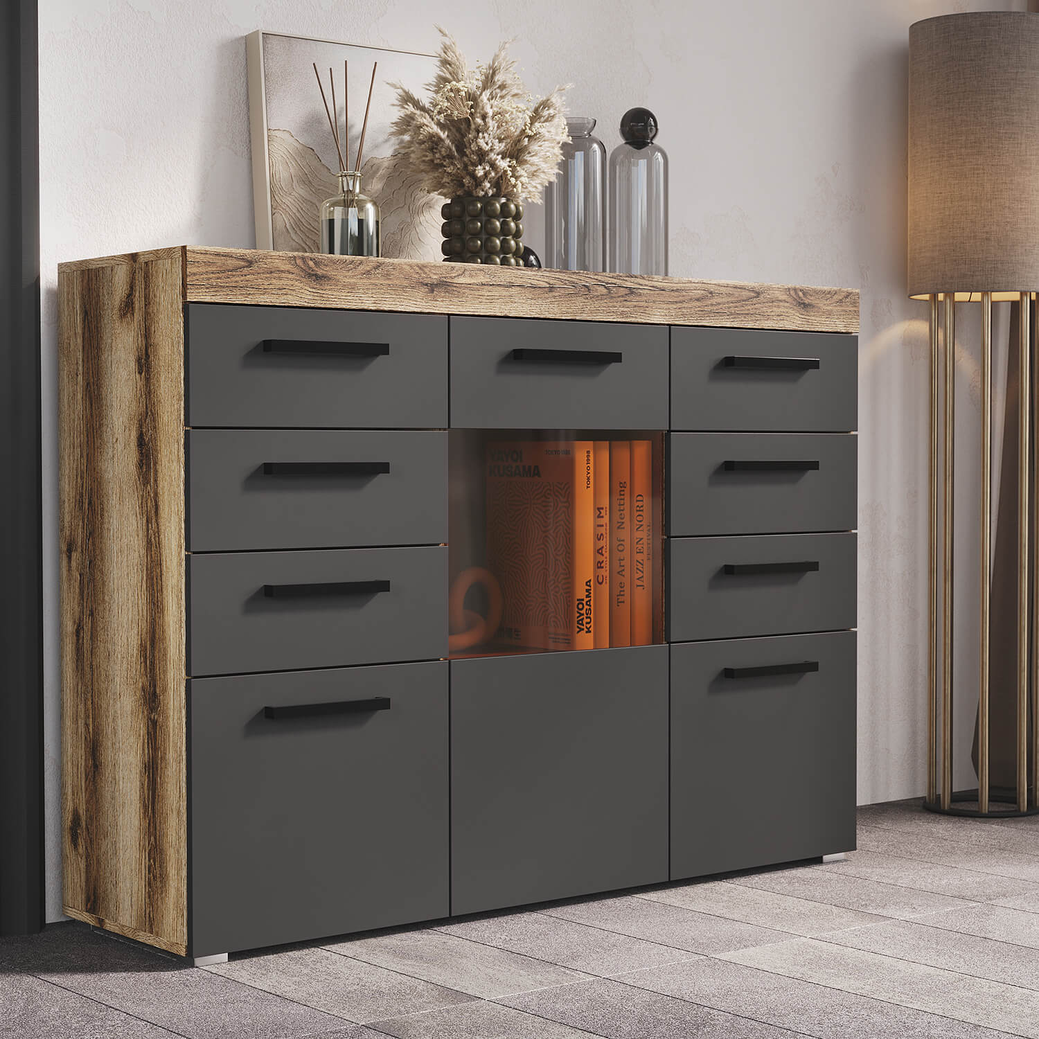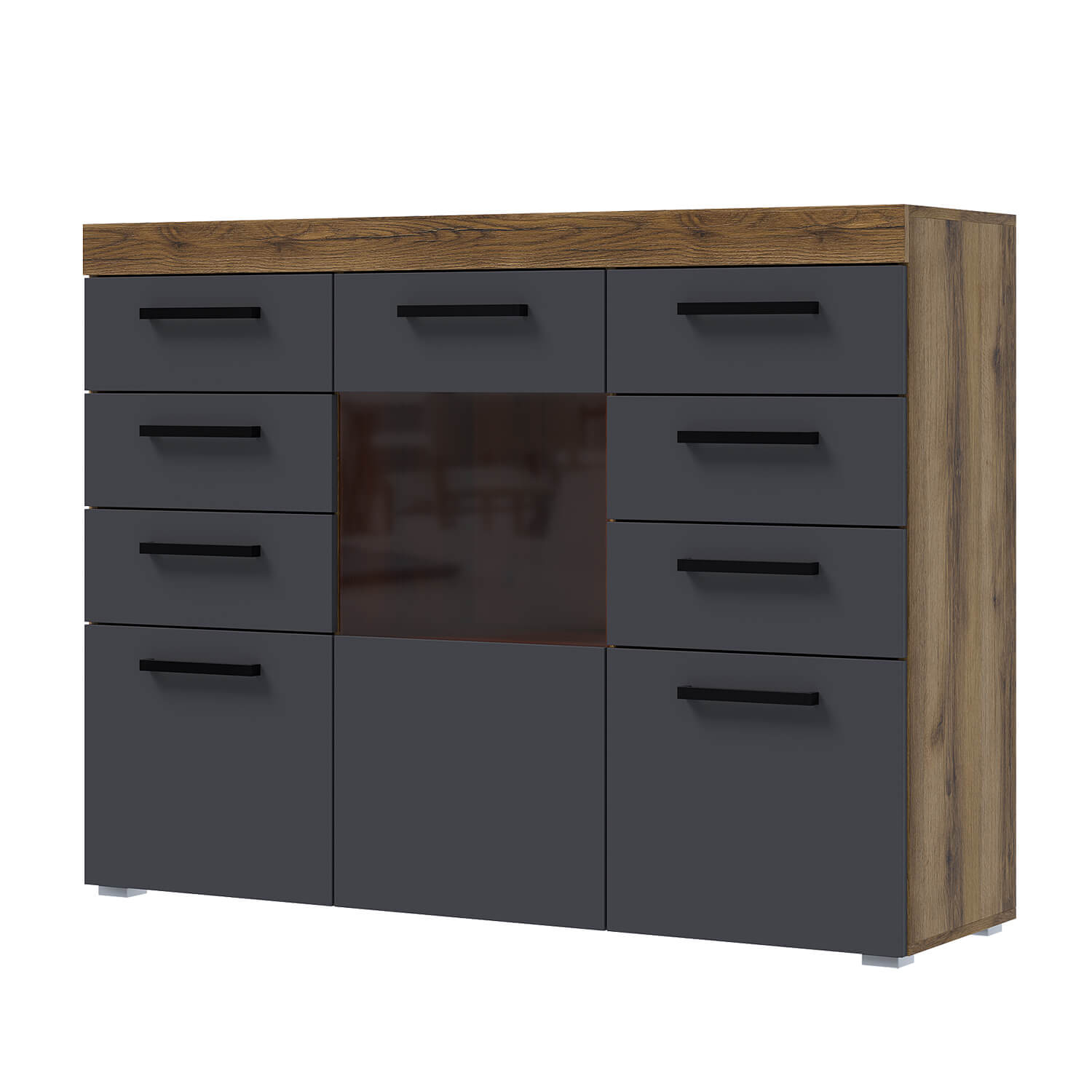 Комод “Бастон” выполнен в современном стиле и представляет собой идеальное сочетание функциональности и эстетики. Изготовлен из высококачественного материала, который придает ему прочность и долговечность. Фасад комода в цвете графит эффектно контрастирует с коричневым основанием, создавая стильный и гармоничный образ.