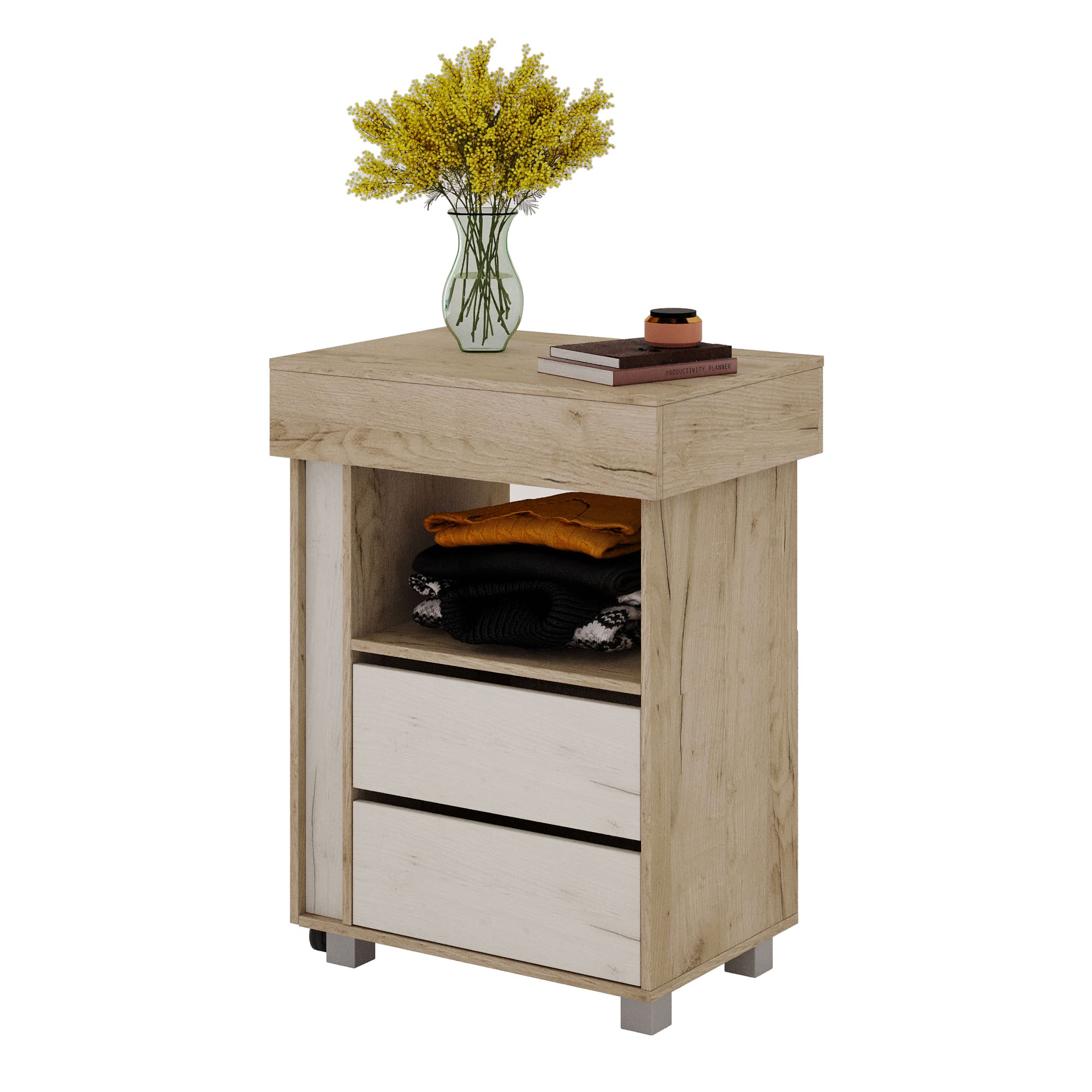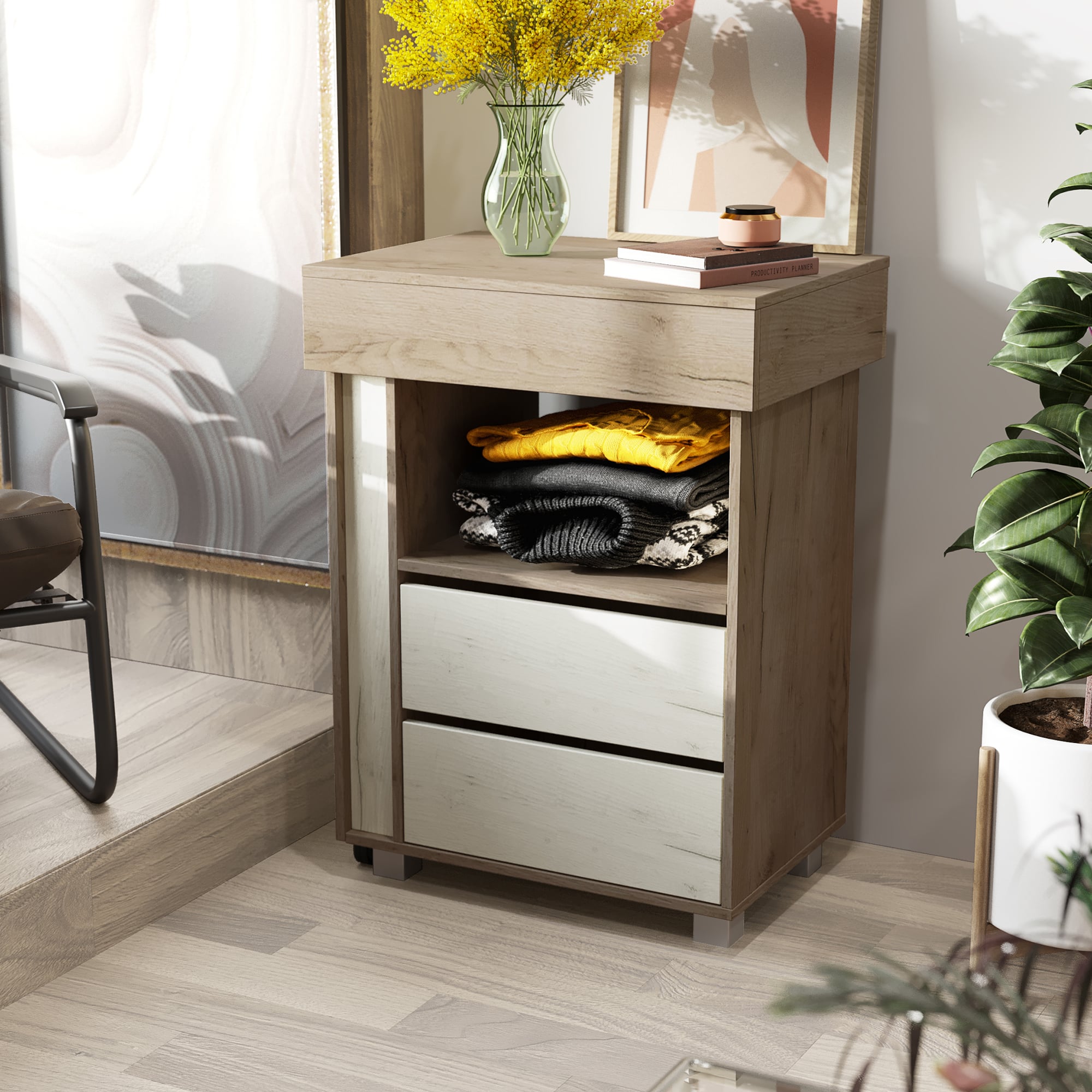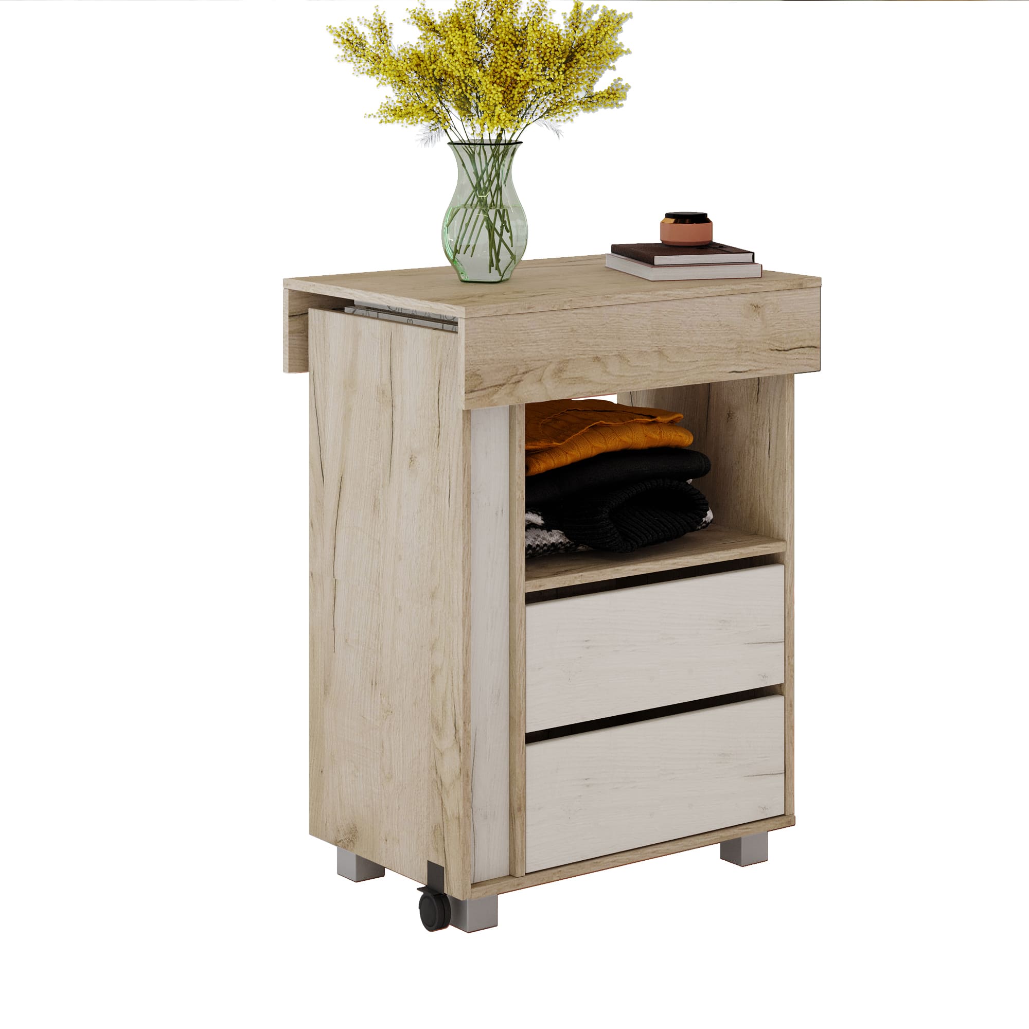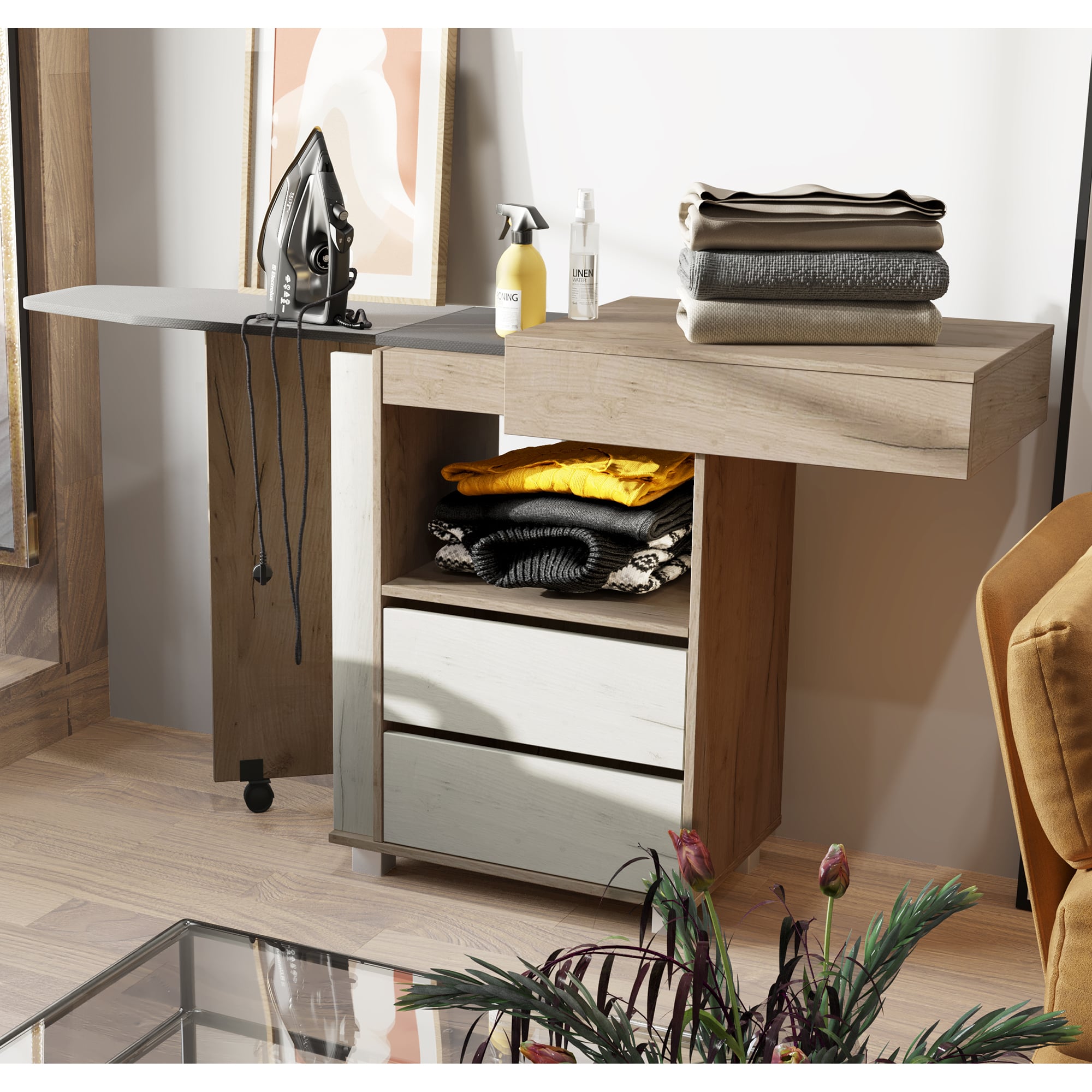 Гладильный комод 02 выполнен в бежевом оттенке шимо и без лицевой фурнитуры. Небольшая и вместительная модель станет украшением спальни или гостиной и легко решит проблему хранения большого количества вещей. Помимо двух выдвижных ящиков комод оборудован скрытой раздвижной столешницей над гладильной поверхностью и складной секцией на поворотно-выкатной опоре.