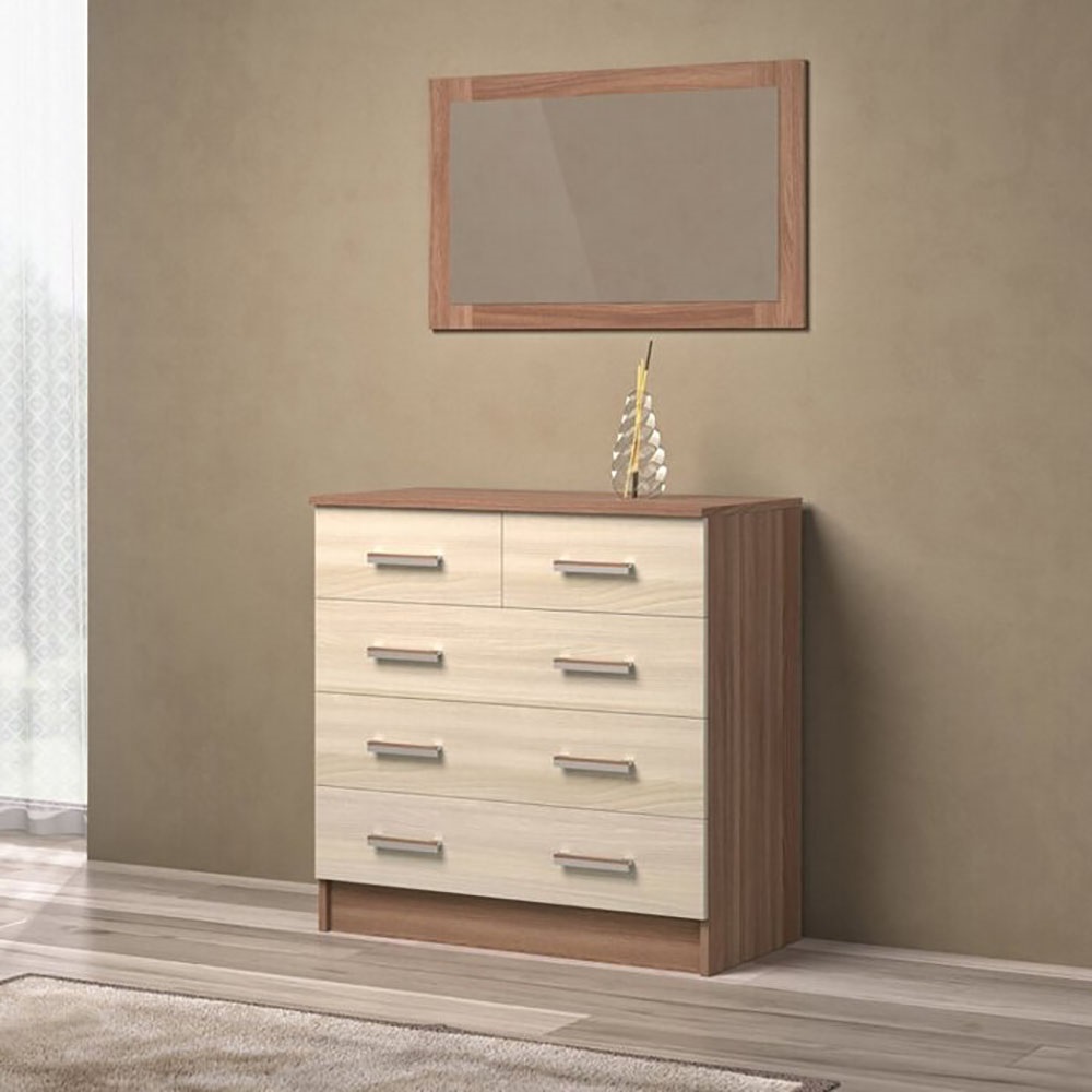 Комод оснащен пятью ящиками с роликовыми направляющими, что обеспечивает плавное и бесшумное открывание и закрывание.