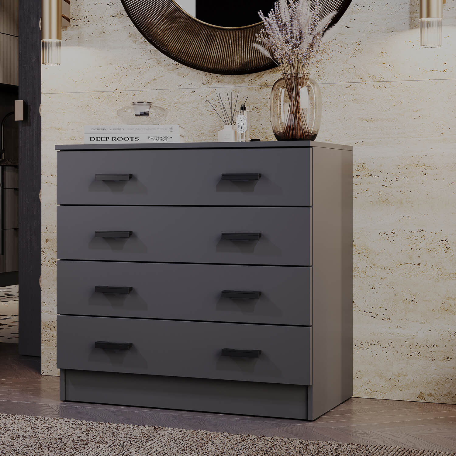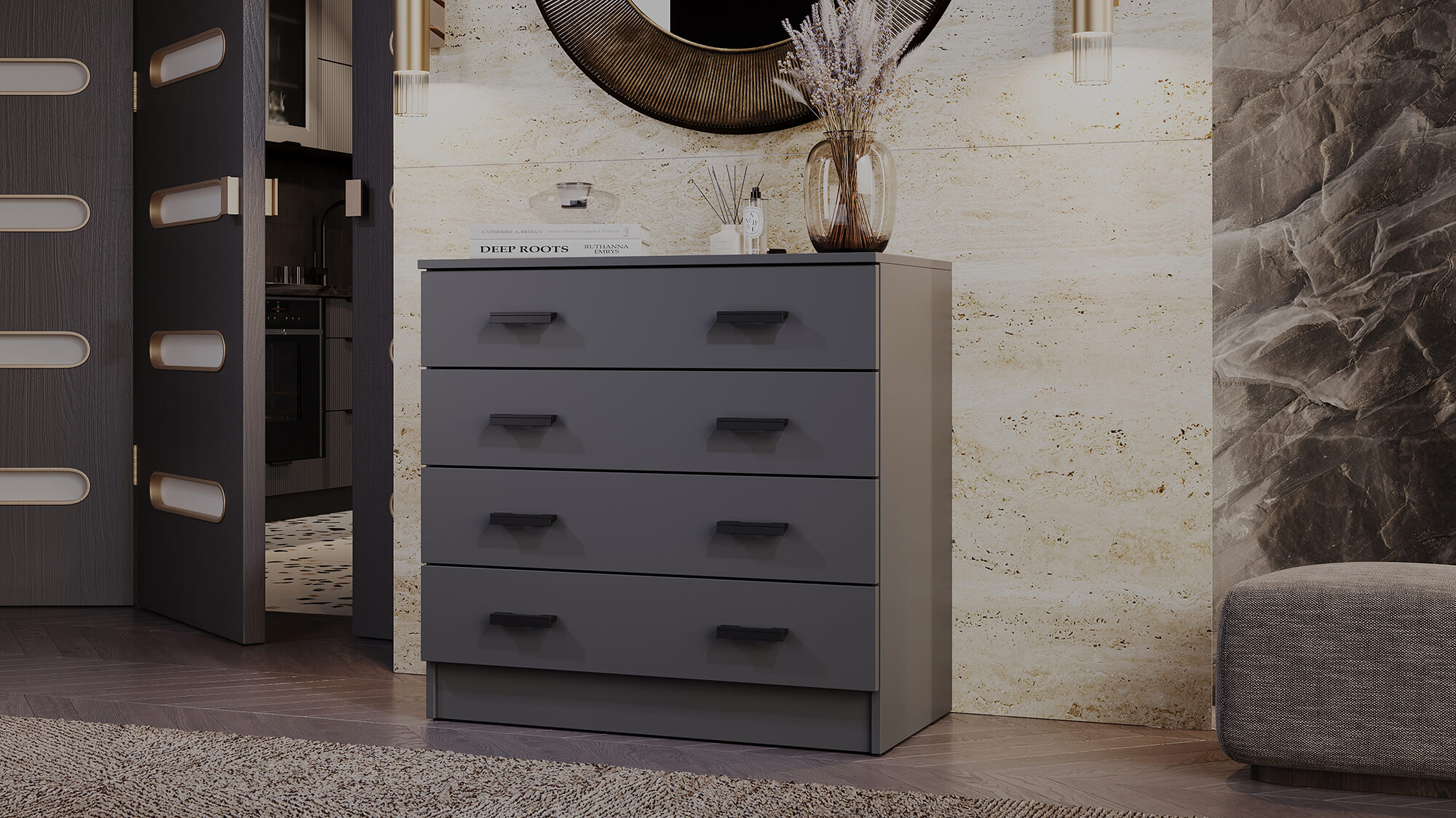 Комод оснащен четырьмя ящиками, что позволяет разместить в нем большое количество вещей.