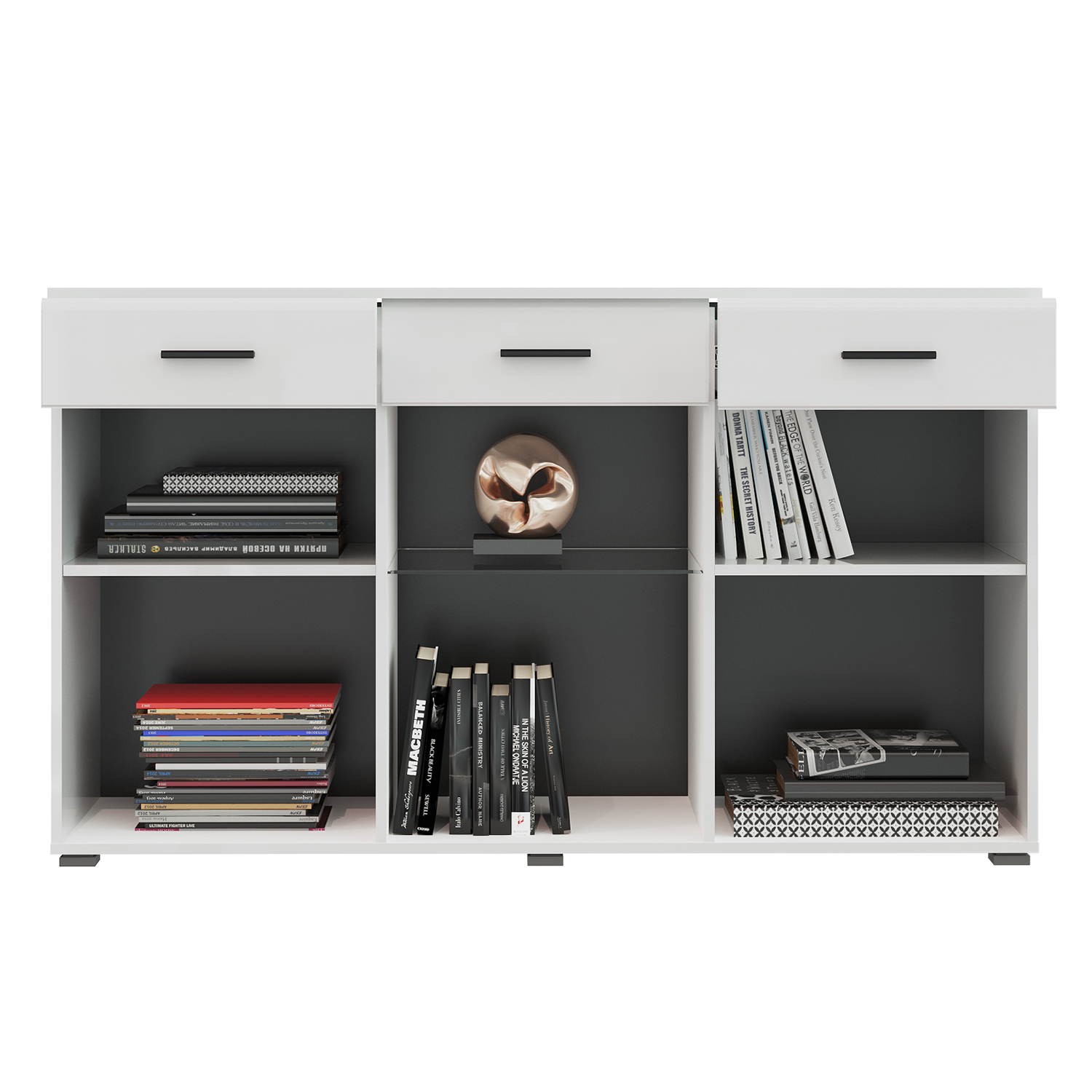 Комод имеет три вместительных ящика с шариковыми направляющими, что обеспечивает плавное и бесшумное открывание и закрывание. Материал фасада - стекло толщиной 4 мм с черным кантом, придает изделию изысканный вид.