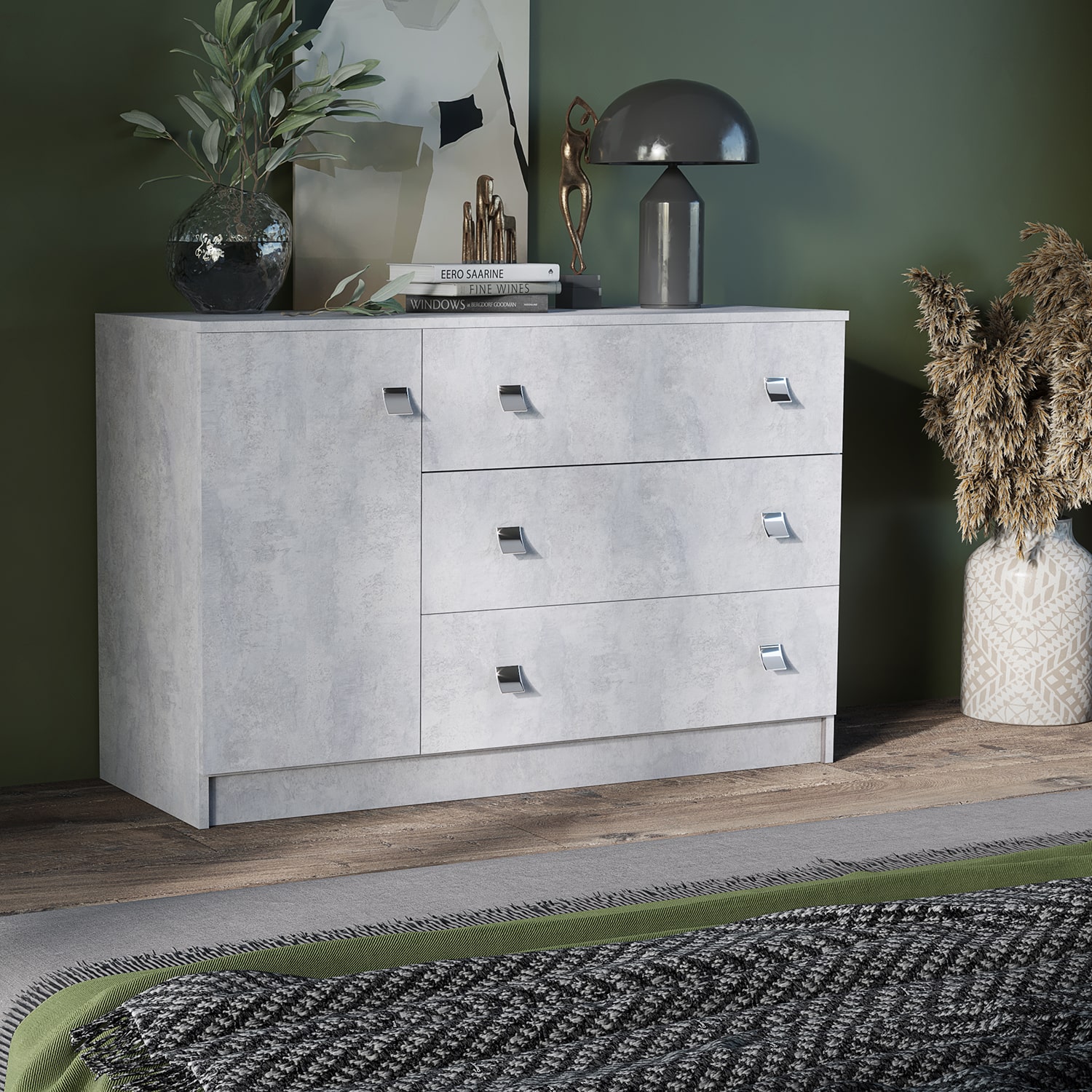 Комод Лофт - это оригинальный элемент интерьера, который подчеркнет ваш стиль и индивидуальность. Он выполнен в современном стиле лофт, который характеризуется простыми формами и геометрическими линиями. Комод имеет широкую столешницу, на которой можно разместить различные предметы. Он также оборудован тремя выдвижными ящиками и одним распашным отделением с полками, что позволяет удобно хранить все необходимые вещи. Комод Лофт станет прекрасным выбором для тех, кто хочет создать уникальный и функциональный интерьер.