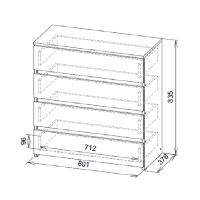 Комод c четырьмя выкатными ящиками на шариковых направляющих. Фасад накладной. Сборка корпуса не универсальная. Максимальная нагрузка на крышку - 10кг. Максимальная нагрузка на ящик - 5кг.