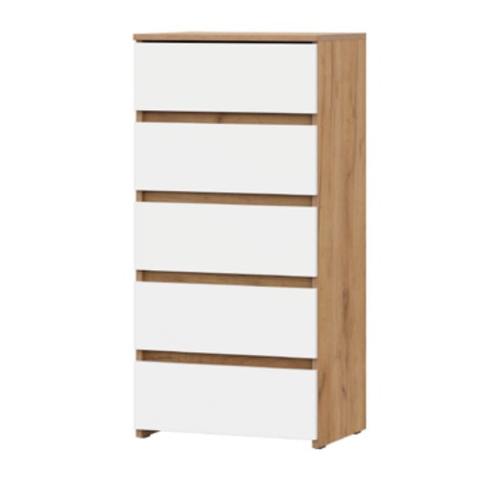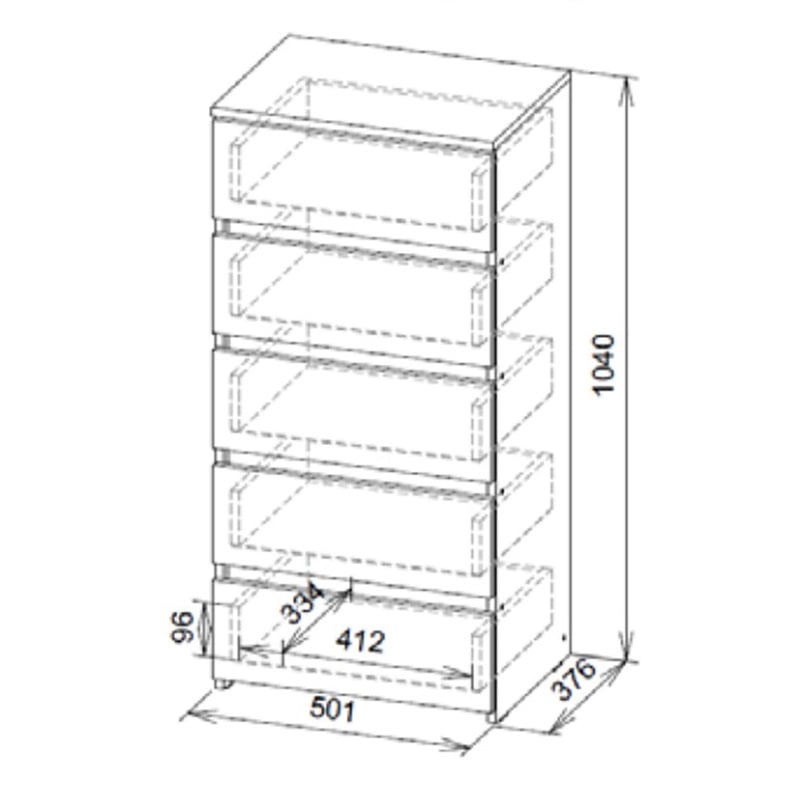 Комод c пятью выкатными ящиками на шариковых направляющих. Фасад накладной. Сборка корпуса не универсальная. Максимальная нагрузка на крышку - 10кг. Максимальная нагрузка на ящик - 5кг.