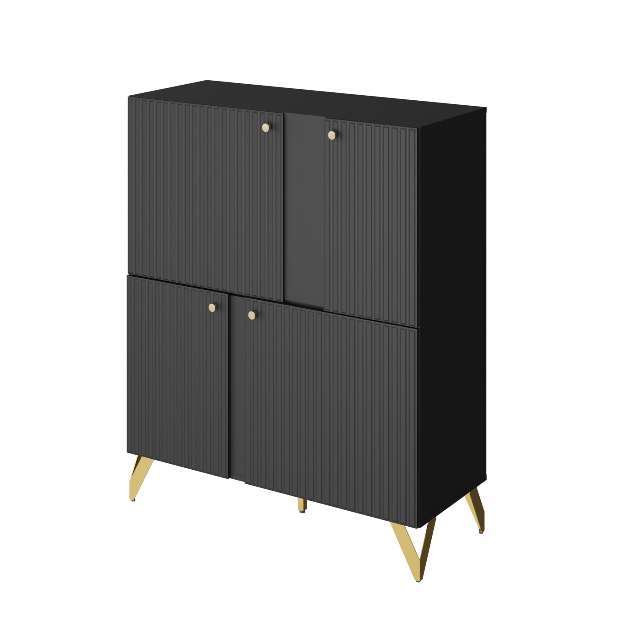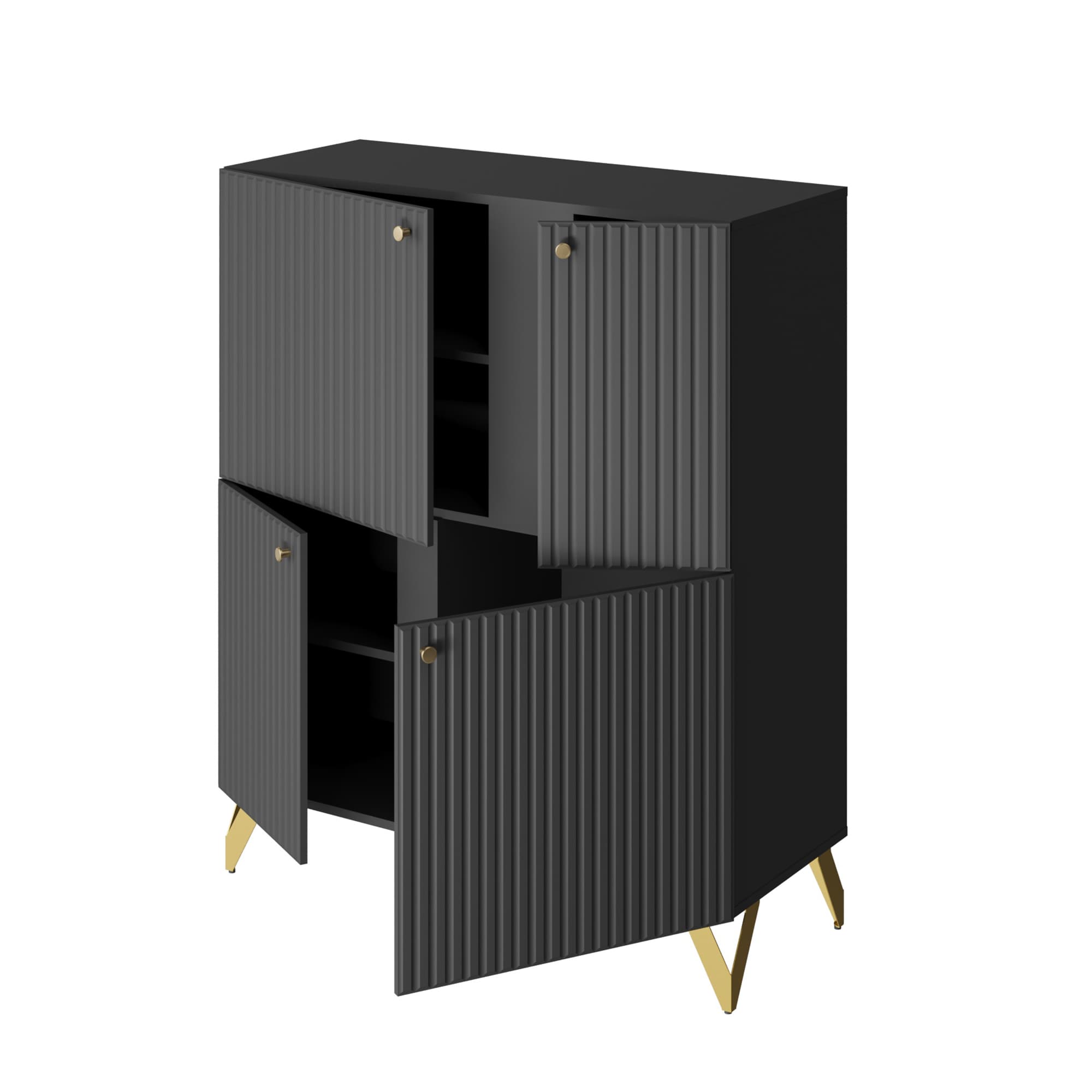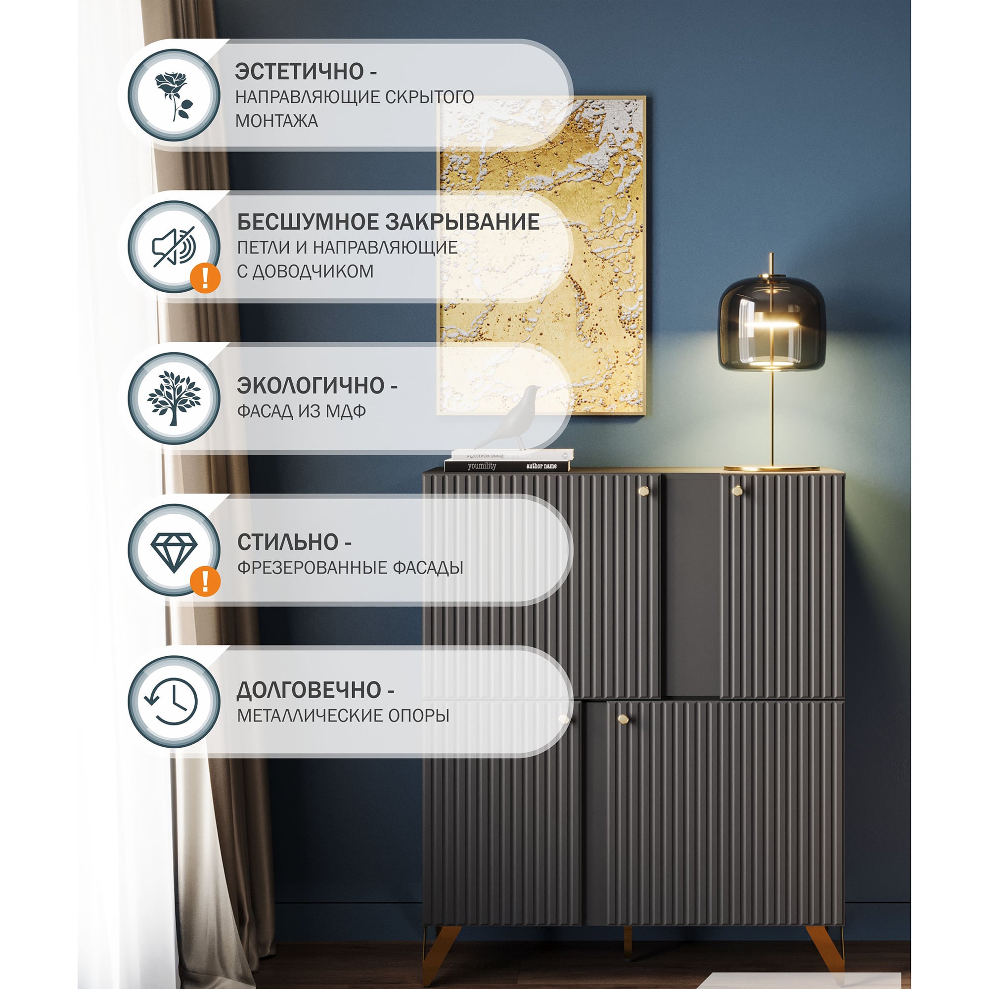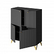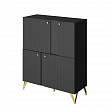 Универсальный черный цвет - комод впишется в любой интерьер. Четыре вместительные секции за распашными дверями - максимальная вместительность. Петли с доводчиком - бесшумное закрывание. Регулируемые опоры - позволяет выставить идеально ровно. Фасады МДФ - экологично. Фрезеровка на фасаде - красиво и современно. Высота опоры 150 мм - удобно для уборки.