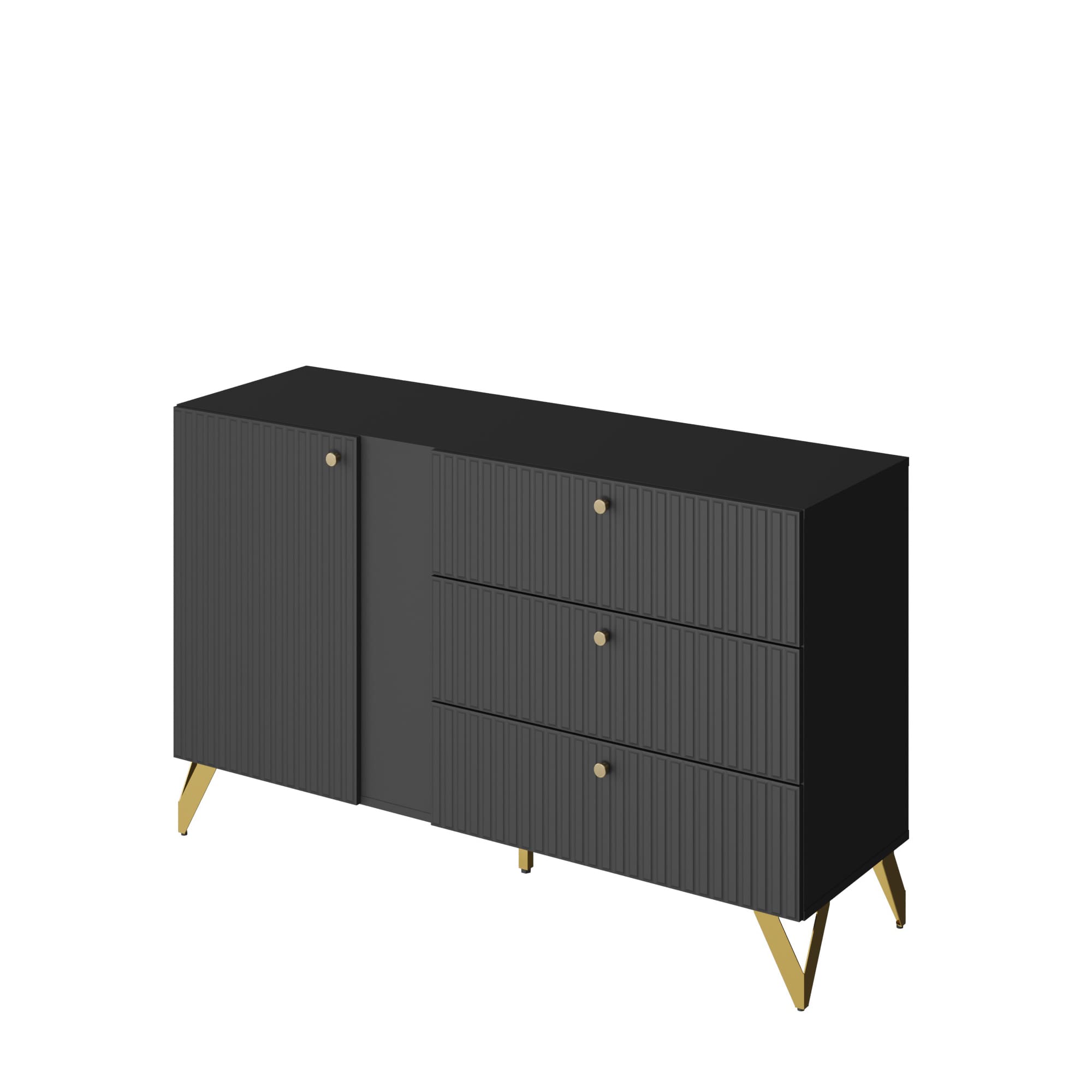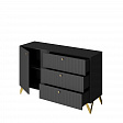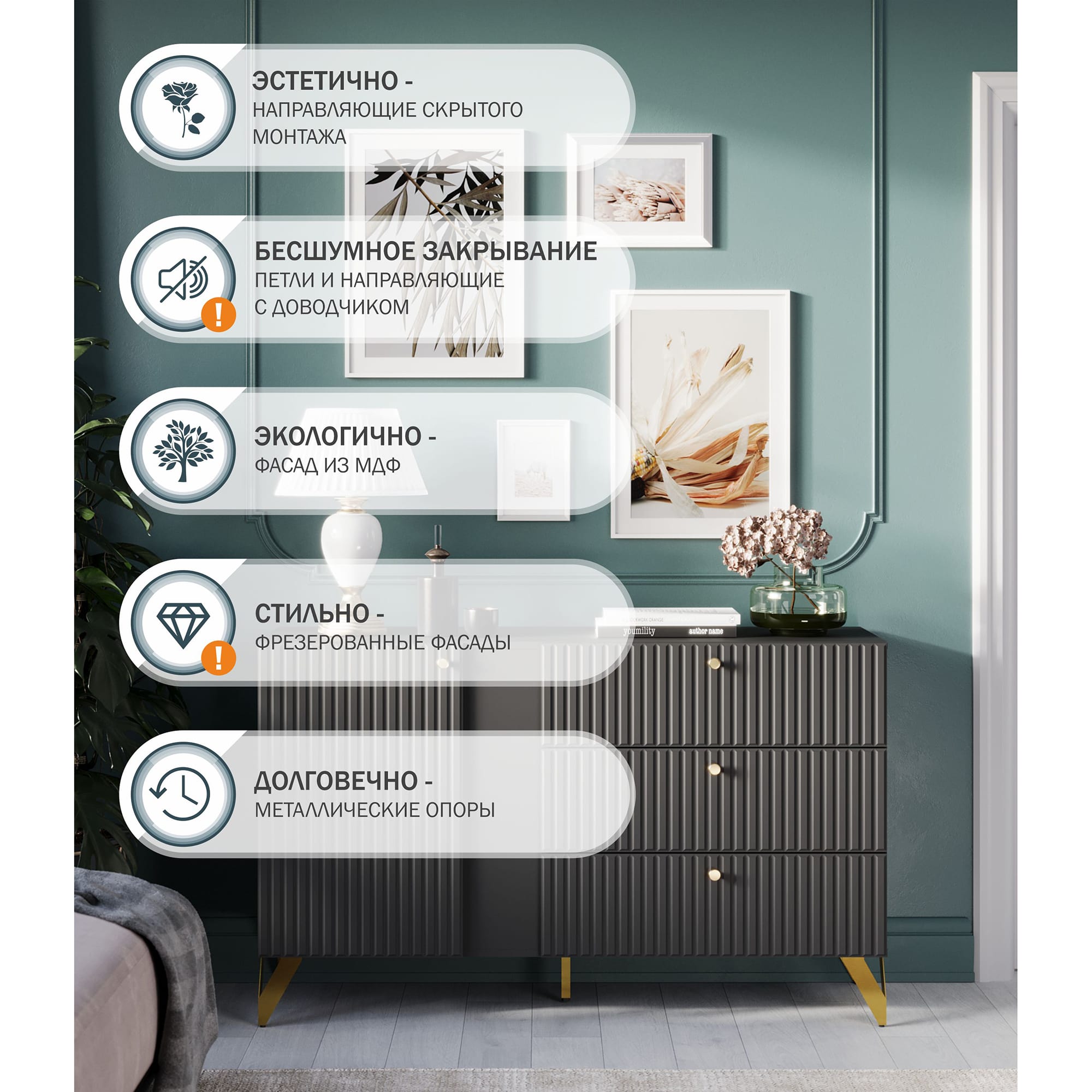 Универсальный черный цвет - комод впишется в любой интерьер. Одна вместительная секция за распашными дверями, три выдвижных ящика - максимальная вместительность. Петли с доводчиком - бесшумное закрывание. Направляющие - усиленные шариковые. Регулируемые опоры - позволяет выставить идеально ровно.  Фасады МДФ - экологично. Фрезеровка на фасаде - красиво и современно. Высота опоры 150 мм - удобно для уборки.