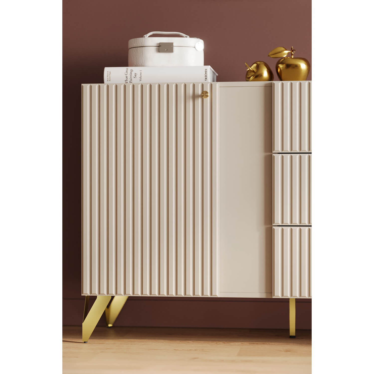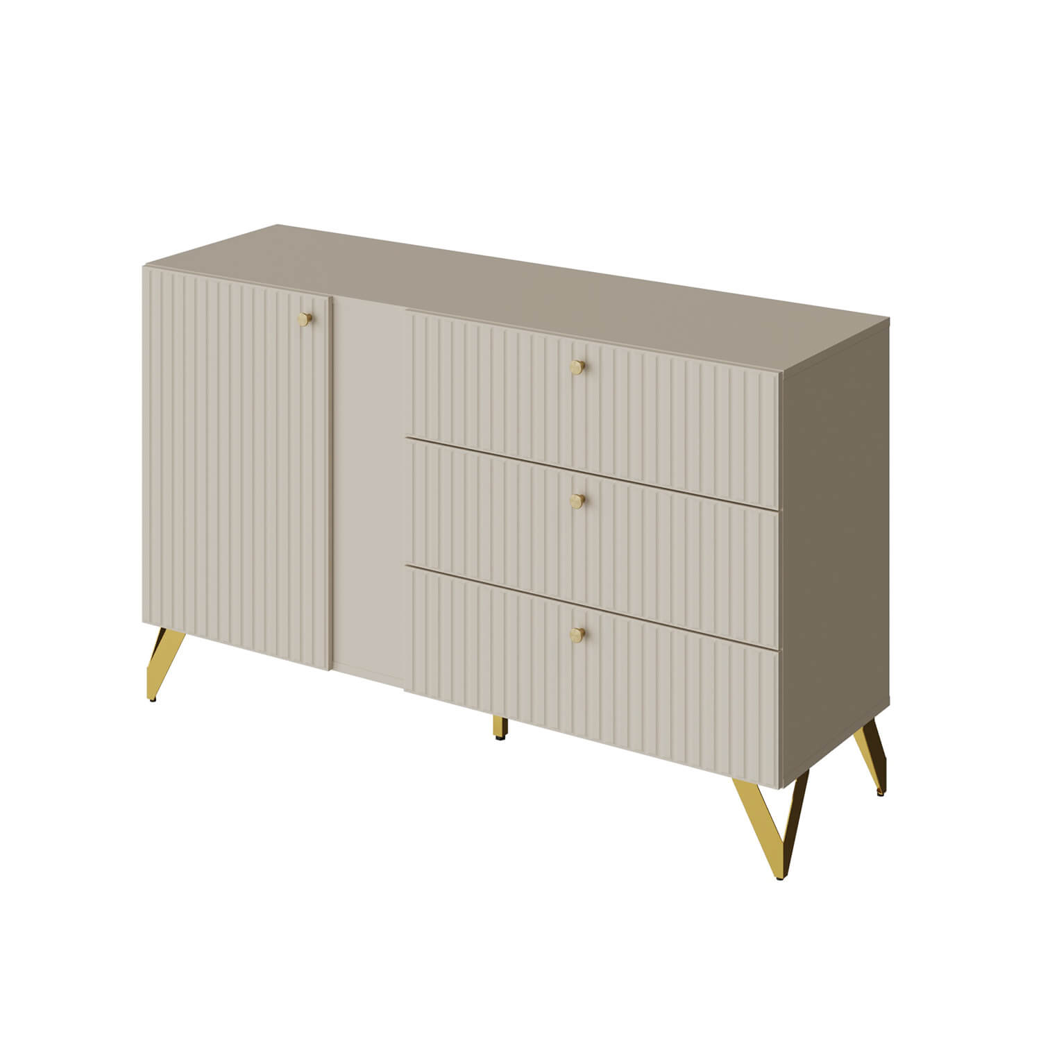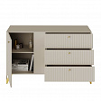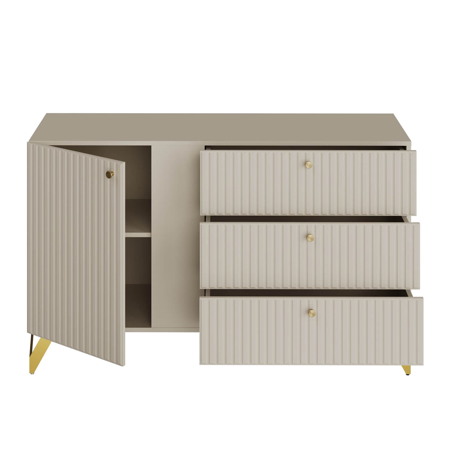 Элегантный цвет "Кашемир" позволит вписать комод в любой интерьер. Одна вместительная секция за распашными дверями, три выдвижных ящика - максимальная вместительность. Петли с доводчиком - бесшумное закрывание. Направляющие - усиленные шариковые. Регулируемые опоры - позволяет выставить идеально ровно.  Фасады МДФ - экологично. Фрезеровка на фасаде - красиво и современно. Высота опоры 150 мм - удобно для уборки.