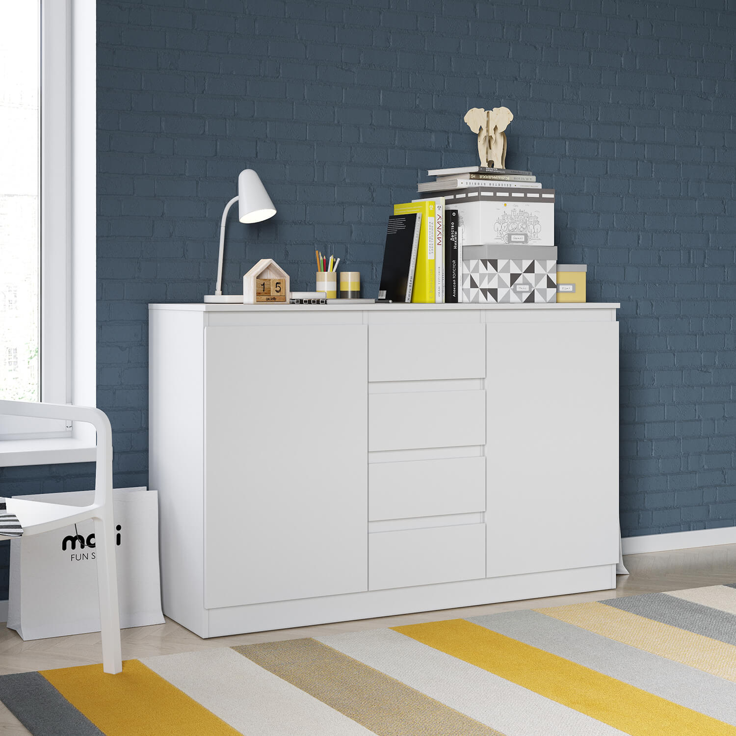 Комод оснащен четырьмя ящиками с роликовыми направляющими, которые обеспечивают плавное и бесшумное открывание. Напольная конструкция позволяет легко перемещать комод по комнате и устанавливать его в любом углу.