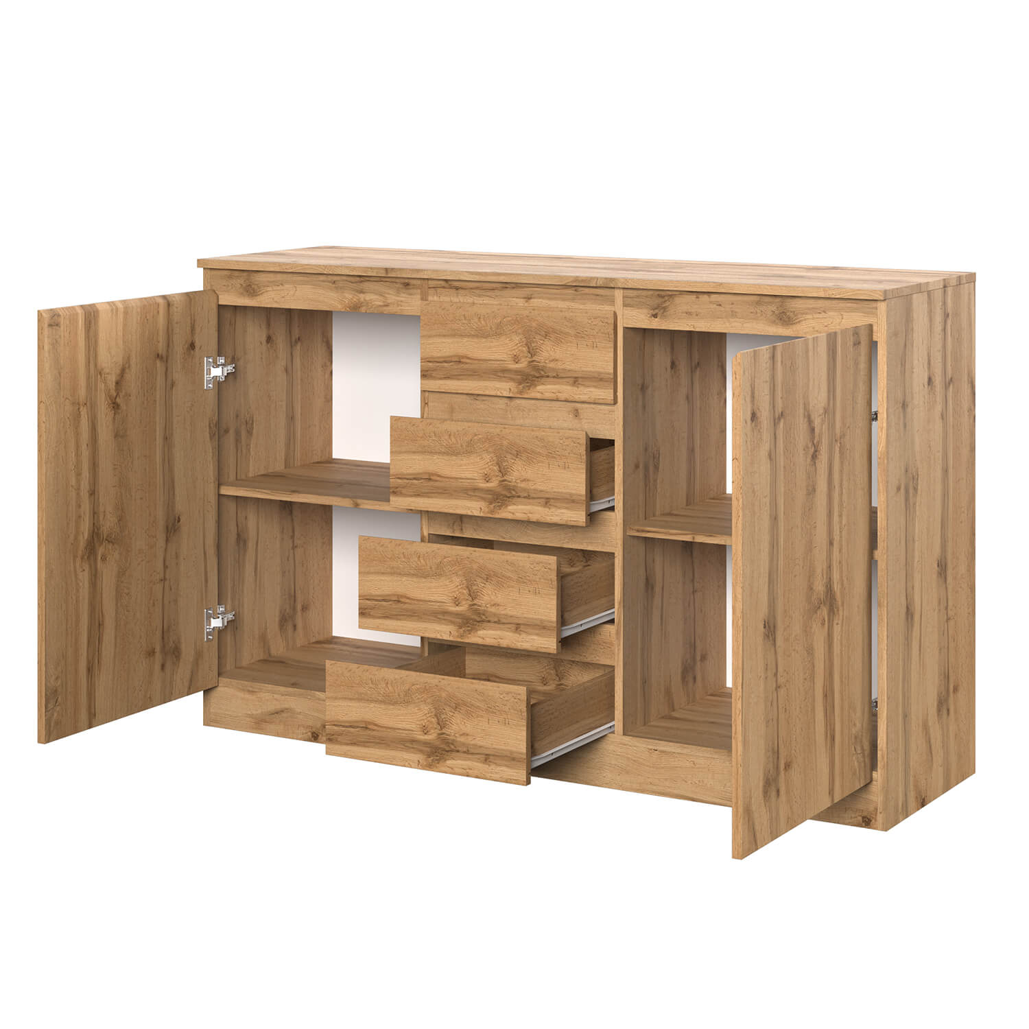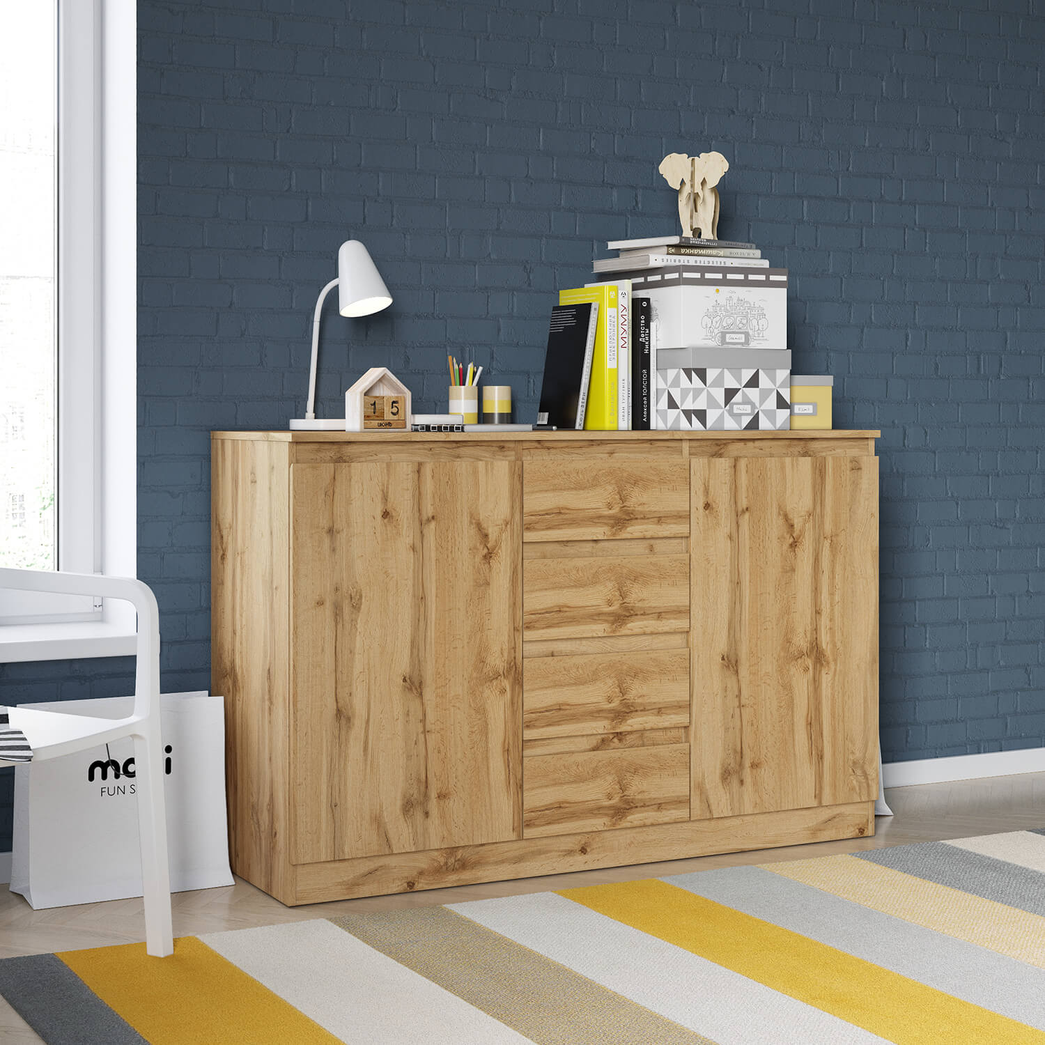 Комод оснащен четырьмя ящиками с роликовыми направляющими, которые обеспечивают плавное и бесшумное открывание. Напольная конструкция позволяет легко перемещать комод по комнате и устанавливать его в любом углу.
