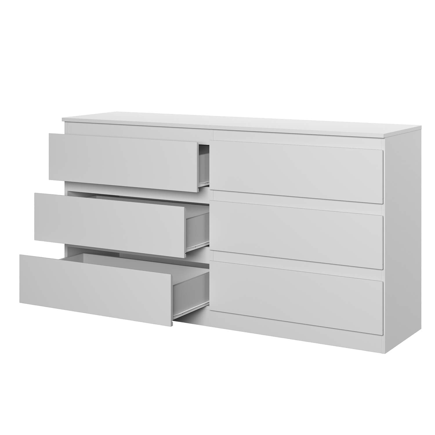 Комод оснащен шестью ящиками с роликовыми направляющими, что обеспечивает плавное и бесшумное открывание и закрывание.