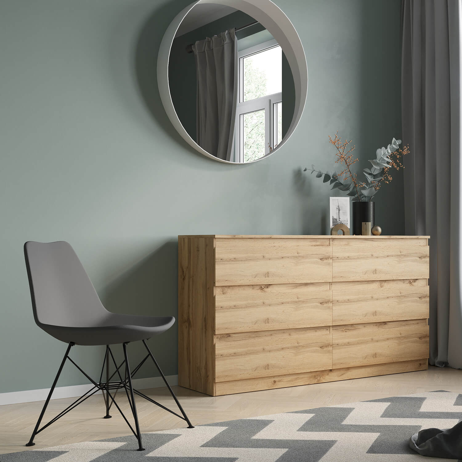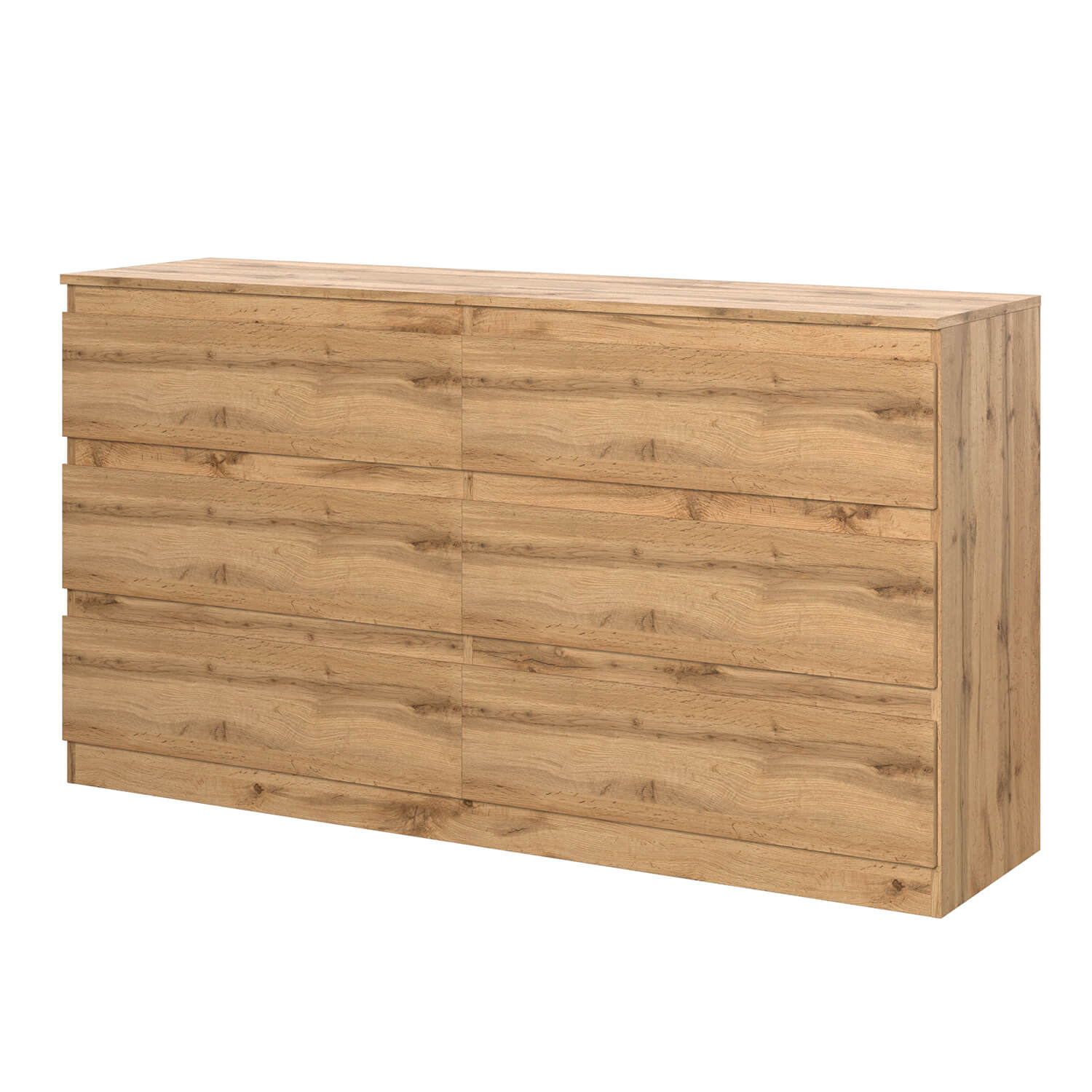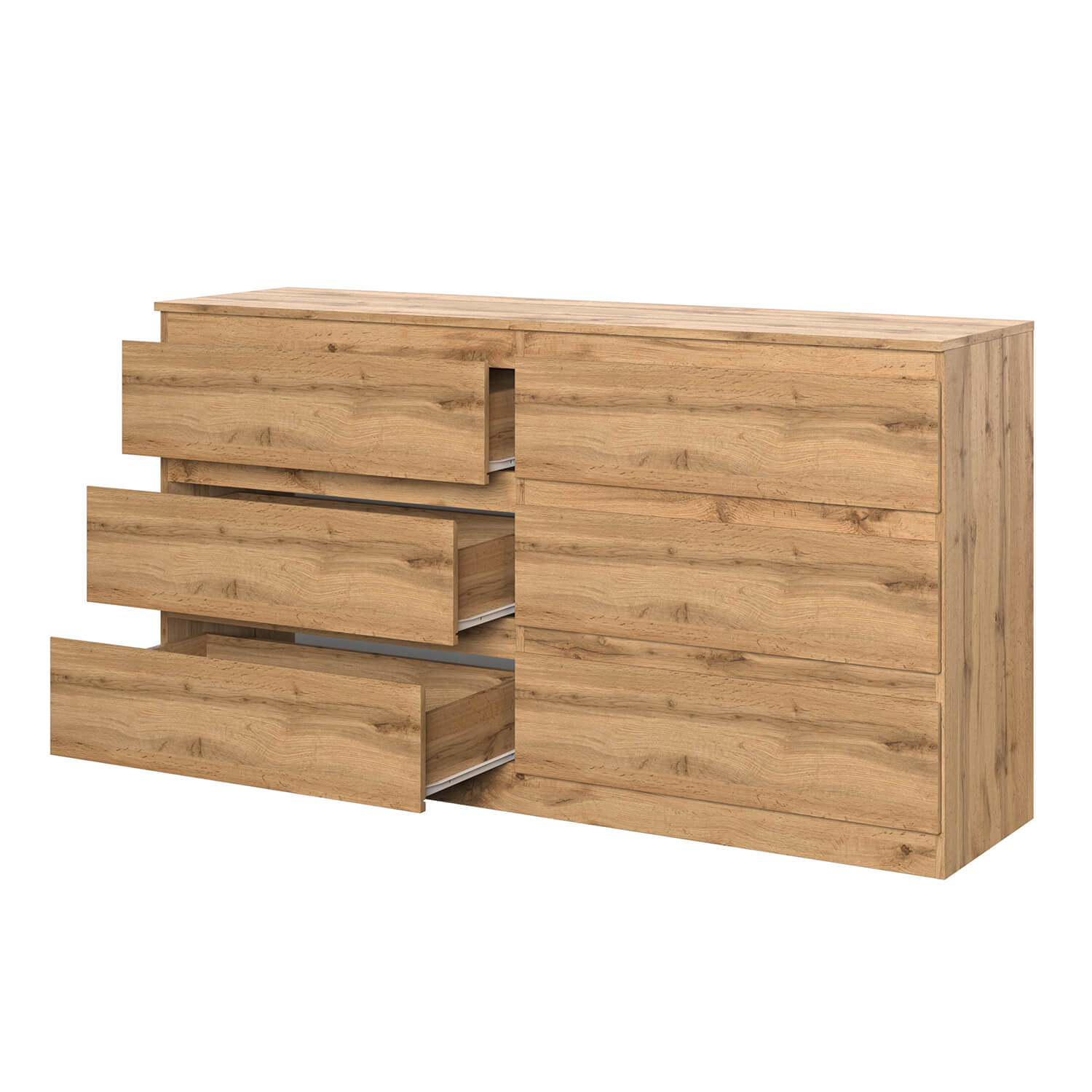 Комод оснащен шестью ящиками с роликовыми направляющими, что обеспечивает плавное и бесшумное открывание и закрывание.