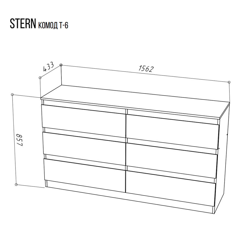Дизайн без лишних деталей и удобные скошенные ручки на фасадах делают комод STERN Т-6 уместным в любой комнате. Модные цвета декоративной отделки и материал ЛДСП 16 мм придают изделию современный и стильный вид.