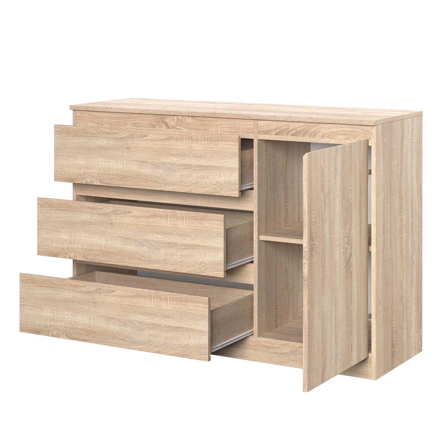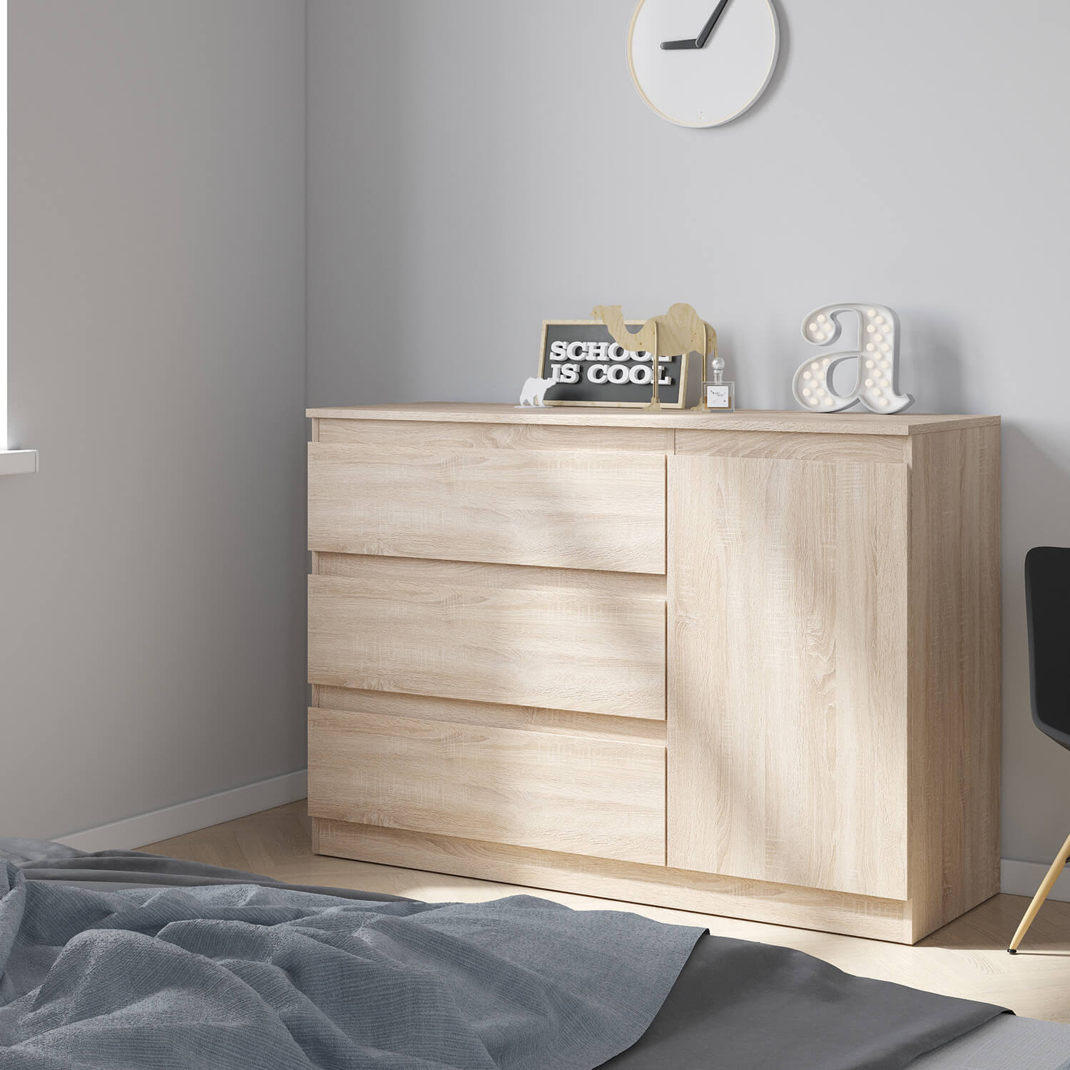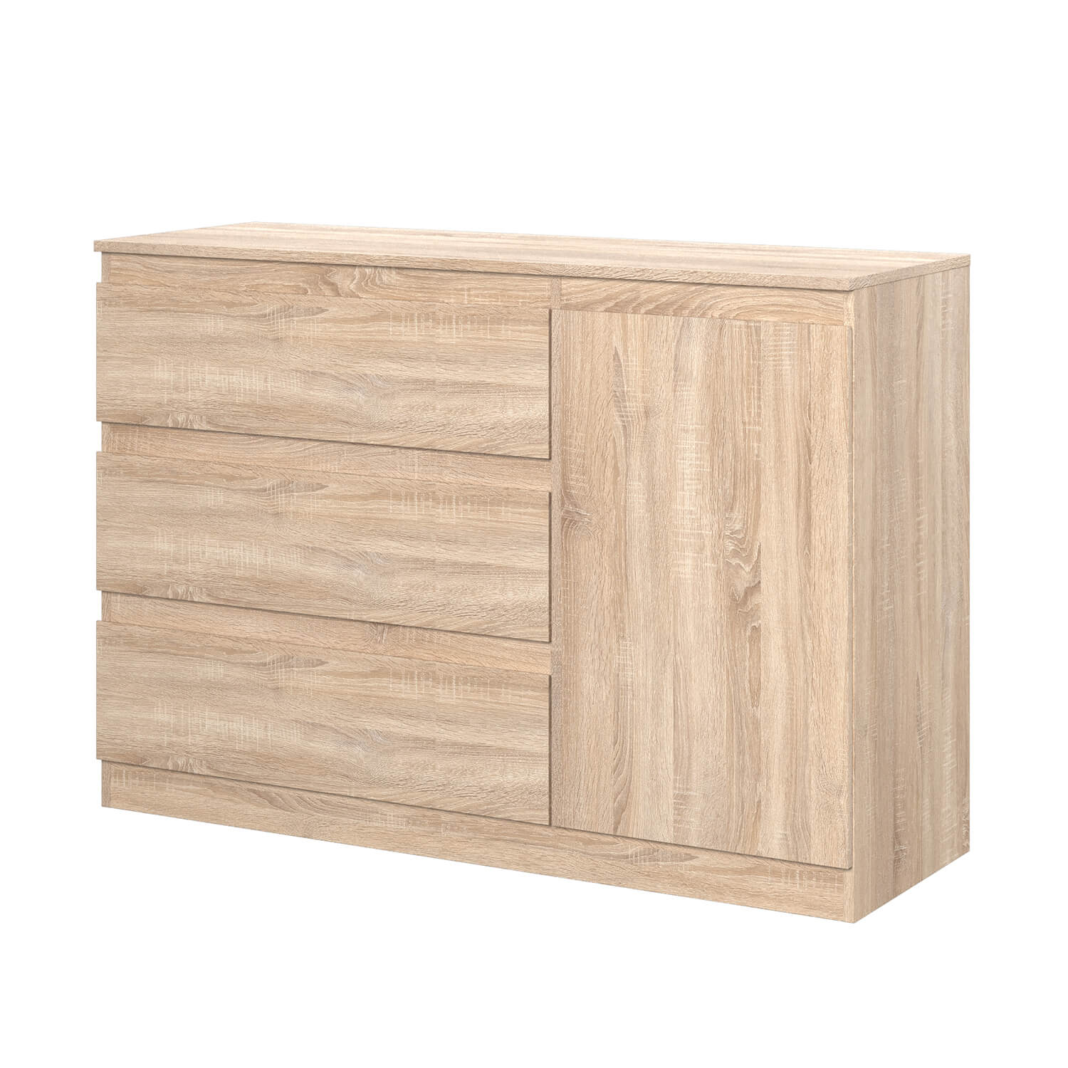 Комод выполнен в современном стиле, что придает ему особый шарм и позволяет гармонично вписаться в любой интерьер. Материал корпуса и фасада - ЛДСП 16 мм, что обеспечивает прочность и долговечность изделия. Цвет товара - бежевый, дуб сонома, что позволяет ему гармонично сочетаться с различными оттенками и текстурами. Комод оснащен тремя ящиками с роликовыми направляющими, что обеспечивает плавное и бесшумное открывание и закрывание. На фасадах отсутствуют ручки, что придает изделию современный и лаконичный вид.