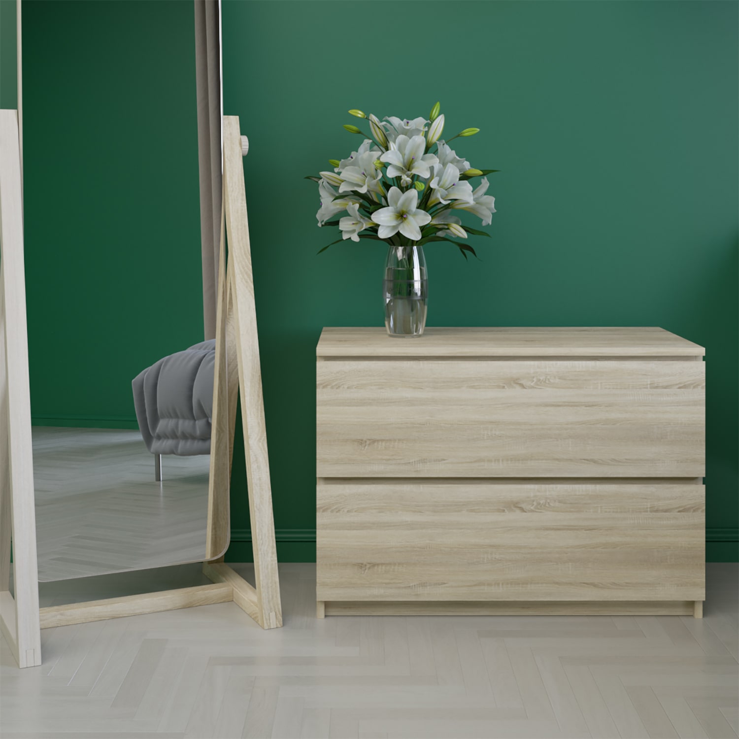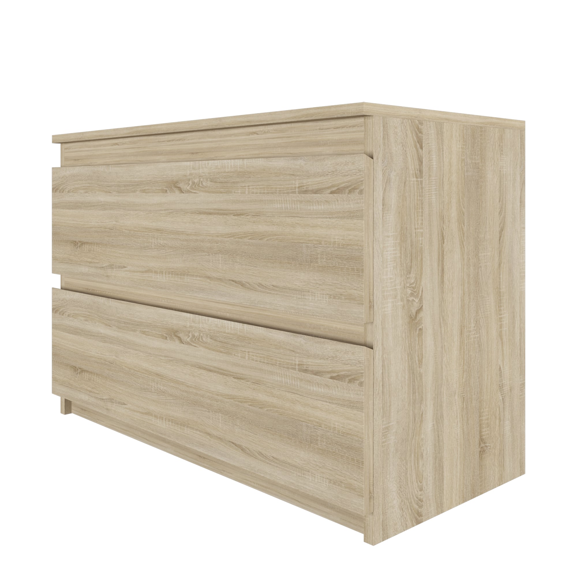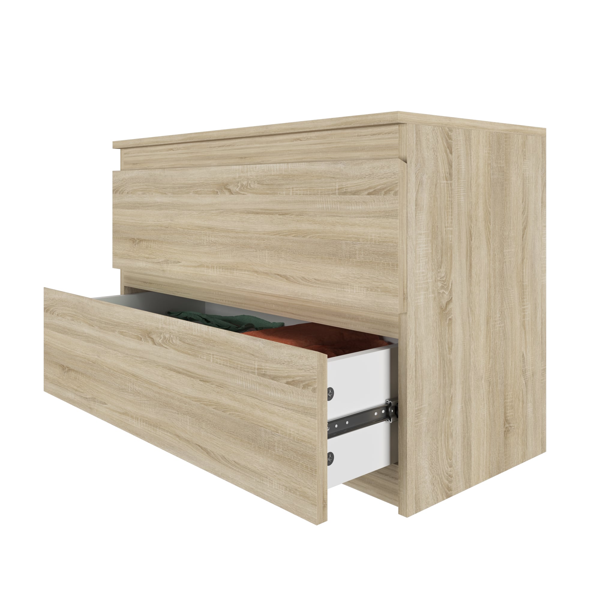 Комод оснащен двумя ящиками, что позволяет удобно хранить различные предметы. Шариковые направляющие обеспечивают плавное и бесшумное открывание ящиков.