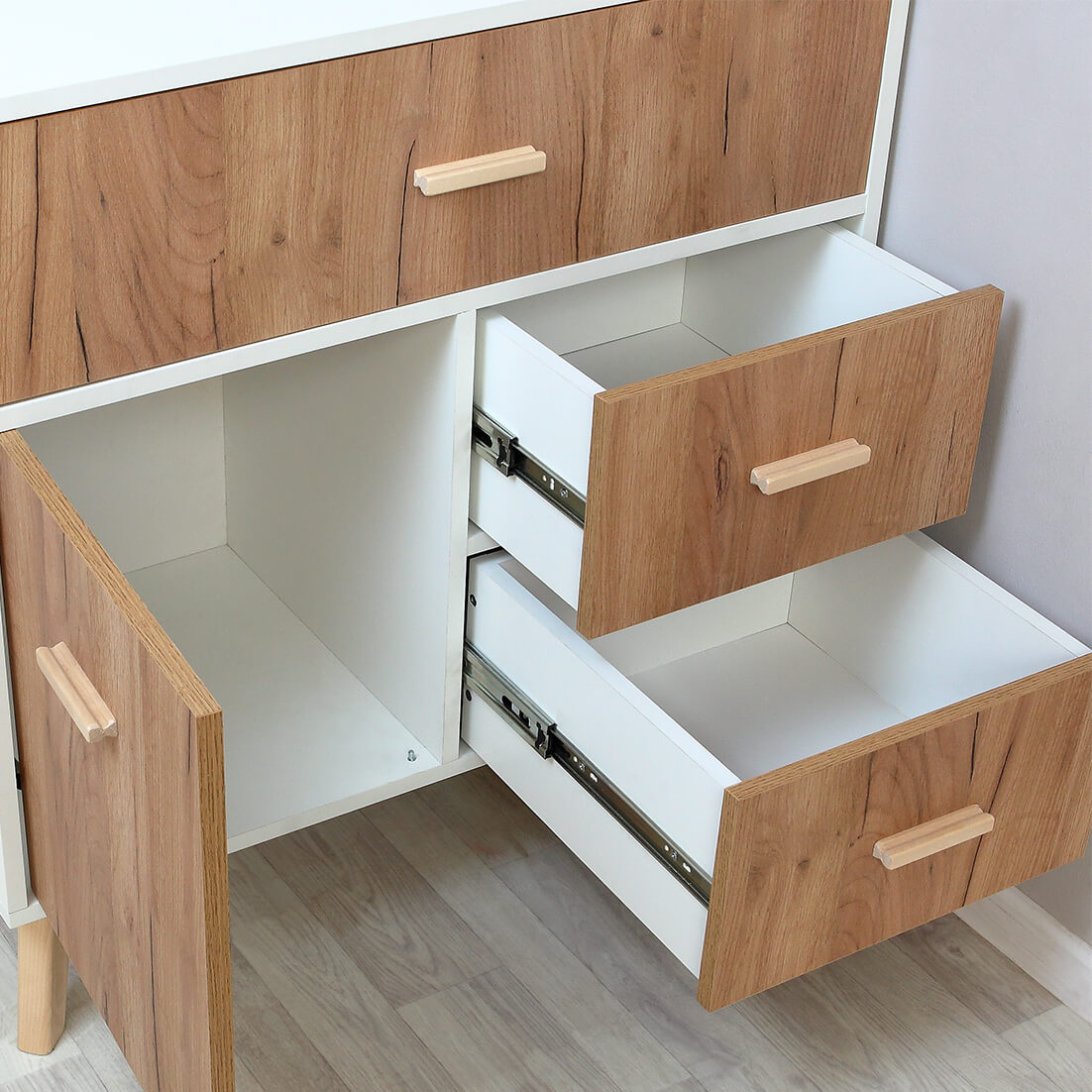 - выдвижные ящики на телескопических направляющих, которые обеспечивают полное и плавное открывание ящика и выдерживают большие нагрузки;