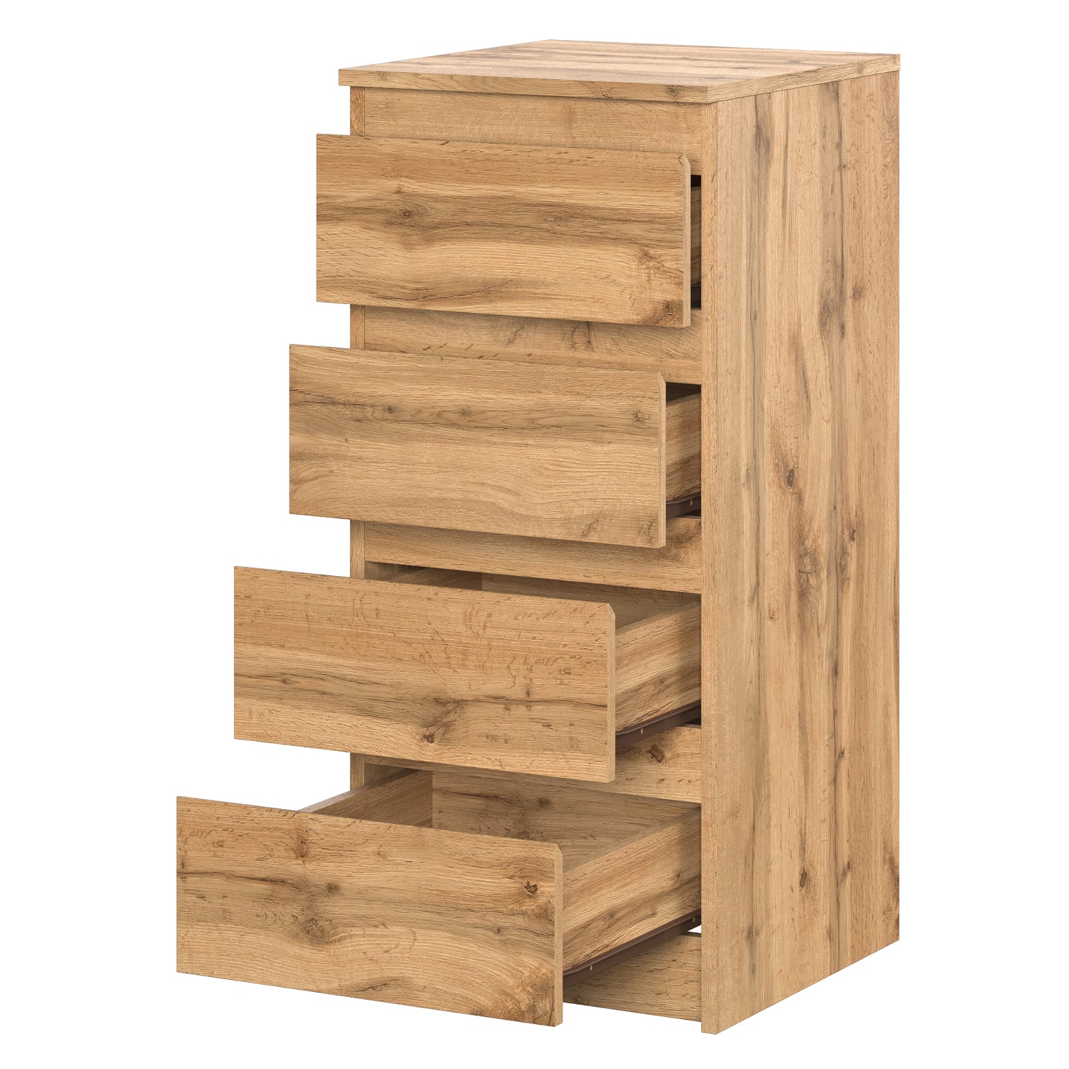 Комод оснащен четырьмя ящиками с роликовыми направляющими, что обеспечивает плавное и бесшумное открывание и закрывание.