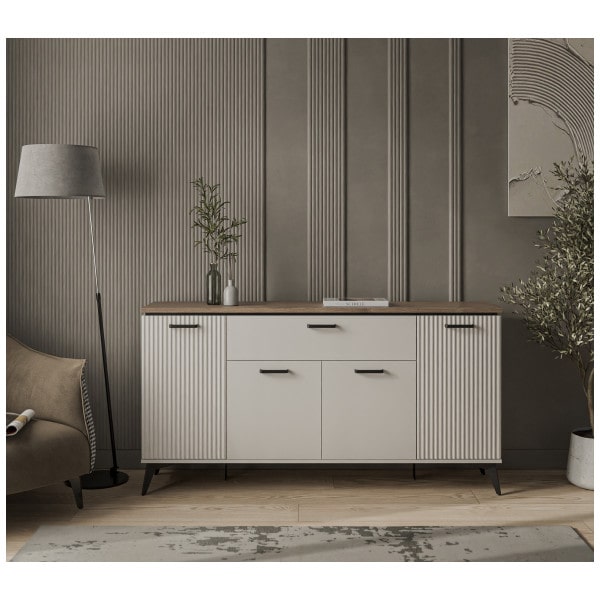 Декор в виде рифленой поверхности на фасаде подчеркивает особенность дизайна коллекции. Добавьте сюда подсветку, украсьте памятными сувенирами, семейными фотографиями и Ваш интерьер засияет поистине новыми красками.