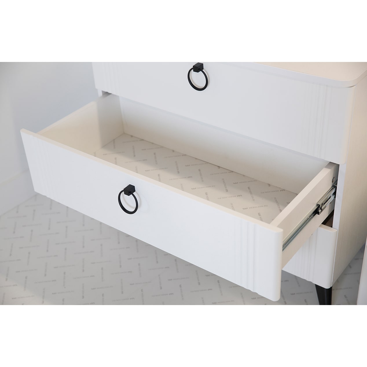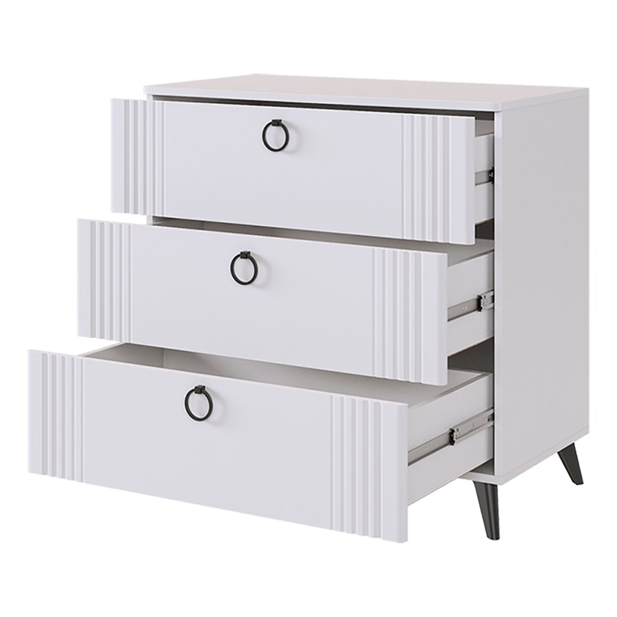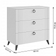 Комод "Ева" идеально сочетает в себе стиль и функциональность. С его размерами 800х428х736 мм он будет отличным дополнением к любому интерьеру. Корпус комода выполнен из ЛДСП в белом деревянном цвете, а фасады - из МДФ, облицованного пленкой ПВХ белого матового цвета. Смело можно сказать, что комод выглядит элегантно. Он оснащен тремя просторными ящиками на шариковых направляющих, что обеспечивает плавное и бесшумное скольжение. Удобные ручки-кнопки добавляют комоду элегантности и обеспечивают удобство использования. Также комод имеет бесшумную систему закрытия фасадов, что делает его идеальным выбором для спален или детских комнат. Пластиковые черные опоры высотой 120 мм придают комоду устойчивсть и добавляют удобство уборки.