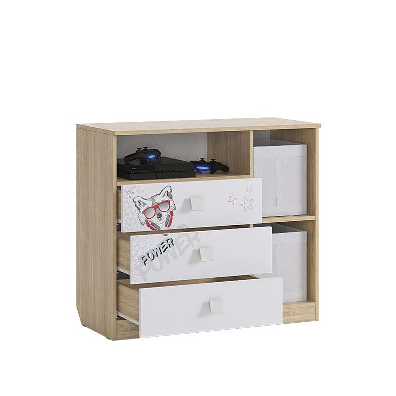 Комод Энерджи предоставляет удобное хранение для детских вещей, игровых приставок и даже телевизора. С открытыми и закрытыми полками, а также ящиками, он обеспечивает легкий доступ ко всему содержимому. Вырез под плинтус делает модель еще более практичной.