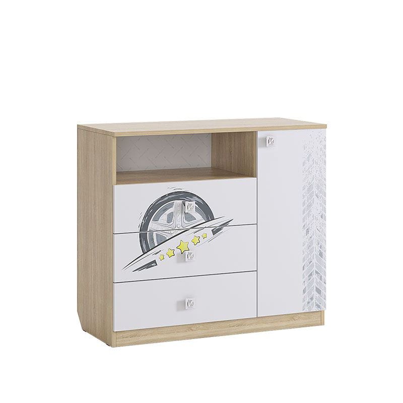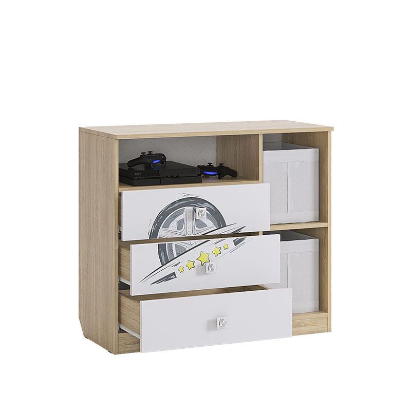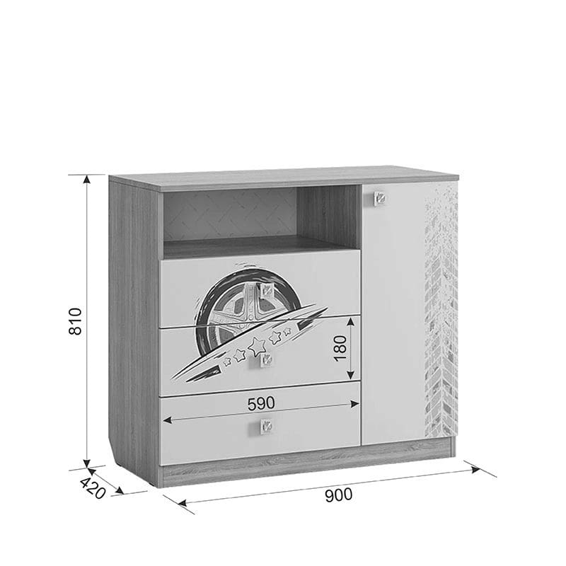 Детский комод Форсаж сочетает в себе стиль и практичность, идеально вписываясь в современный интерьер детской комнаты. Этот комод предлагает достаточно пространства для хранения с ящиками и полками за дверцей, где можно аккуратно разместить детские вещи. На верхней открытой полке удобно хранить игровые приставки, в то время как просторная столешница предназначена для установки телевизора.