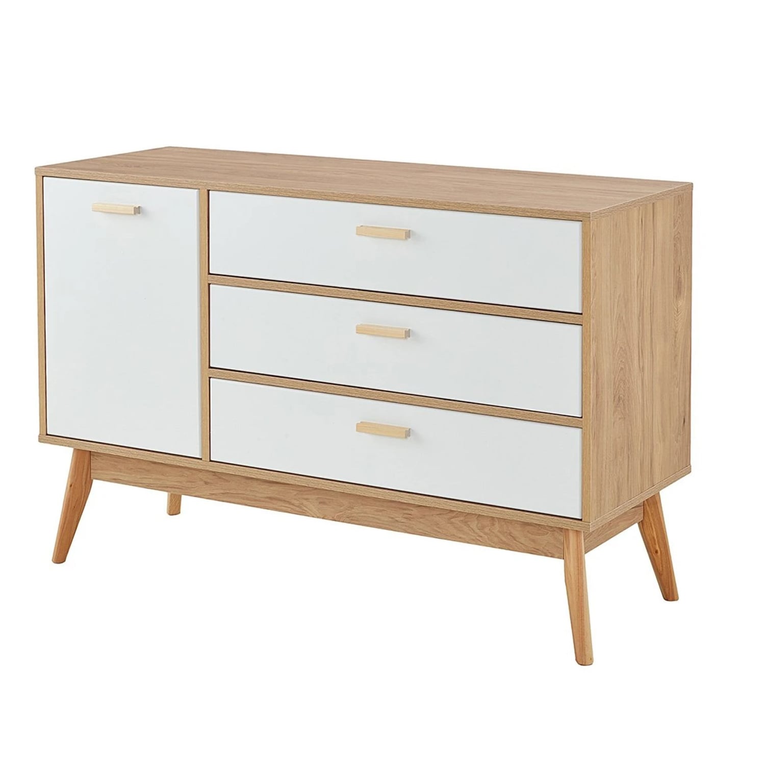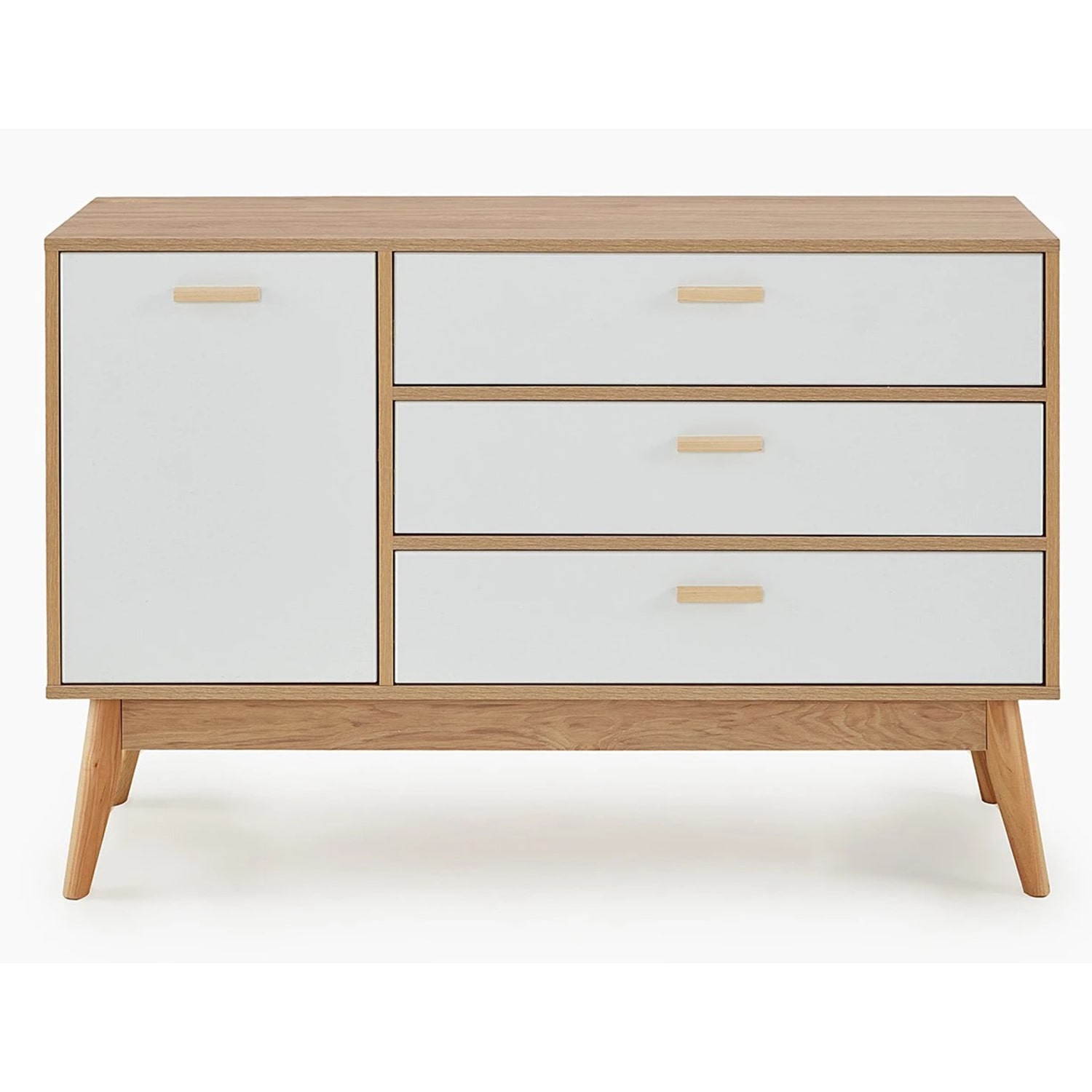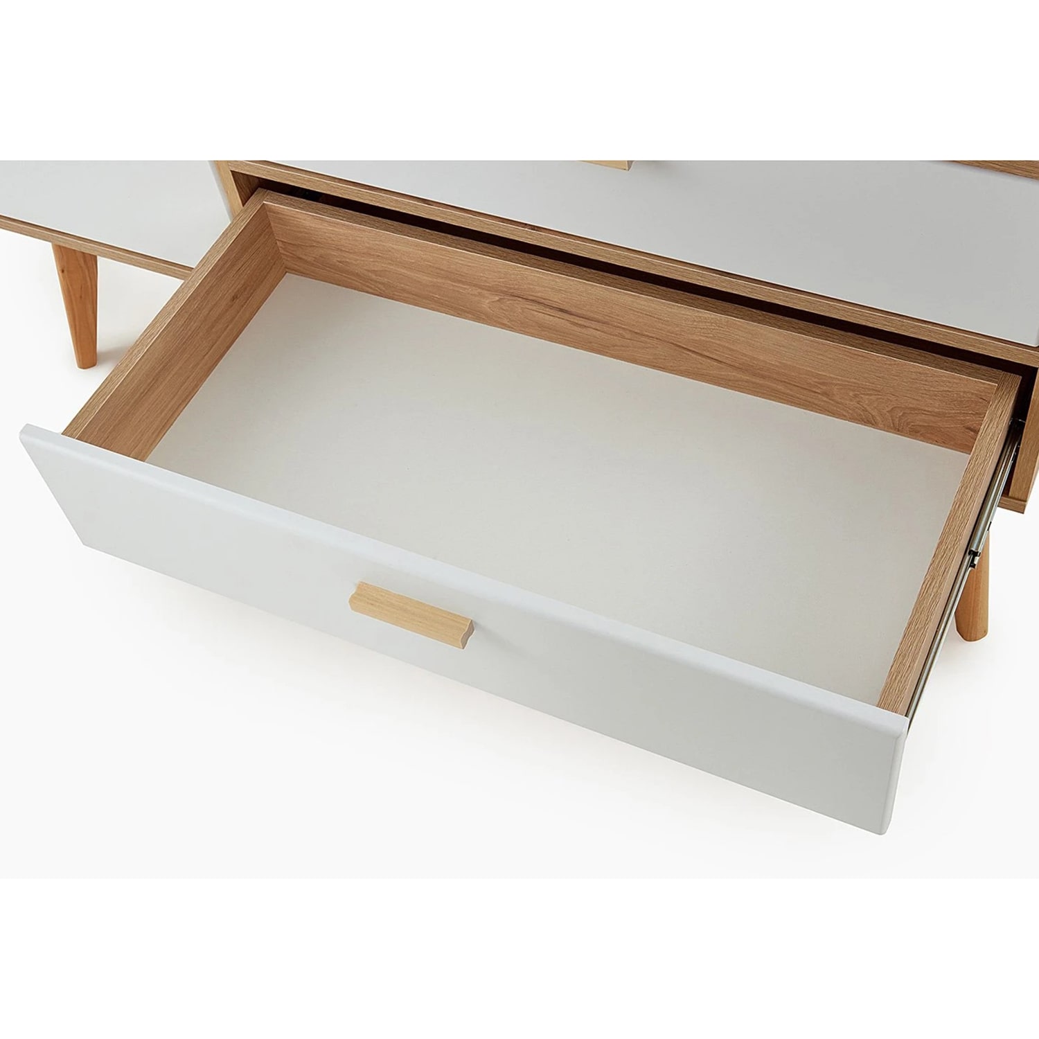 Привлекающий внимание легкостью и комфортом в использовании, комод "Калгари" не только украсит Ваш любимый скандинавский интерьер, но и порадует своей функциональностью. Каркас комода изготовлен из ЛДСП в цвет натурального дуба, фасады ящиков – из МДФ белого матового цвета, стильные и устойчивые ножки - из массива березы.
