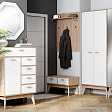 Ящики выдвигаются полностью, что облегчает доступ ко всему их содержимому. Дизайн расставленных под углом стильных опор из массива березы вдохновлен лучшими образцами стиля mid-century modern. Белоснежные фасады из МДФ нарядно смотрятся на фоне корпуса из ЛДСП цвета натурального дуба. Ручки выполнены из массива березы.