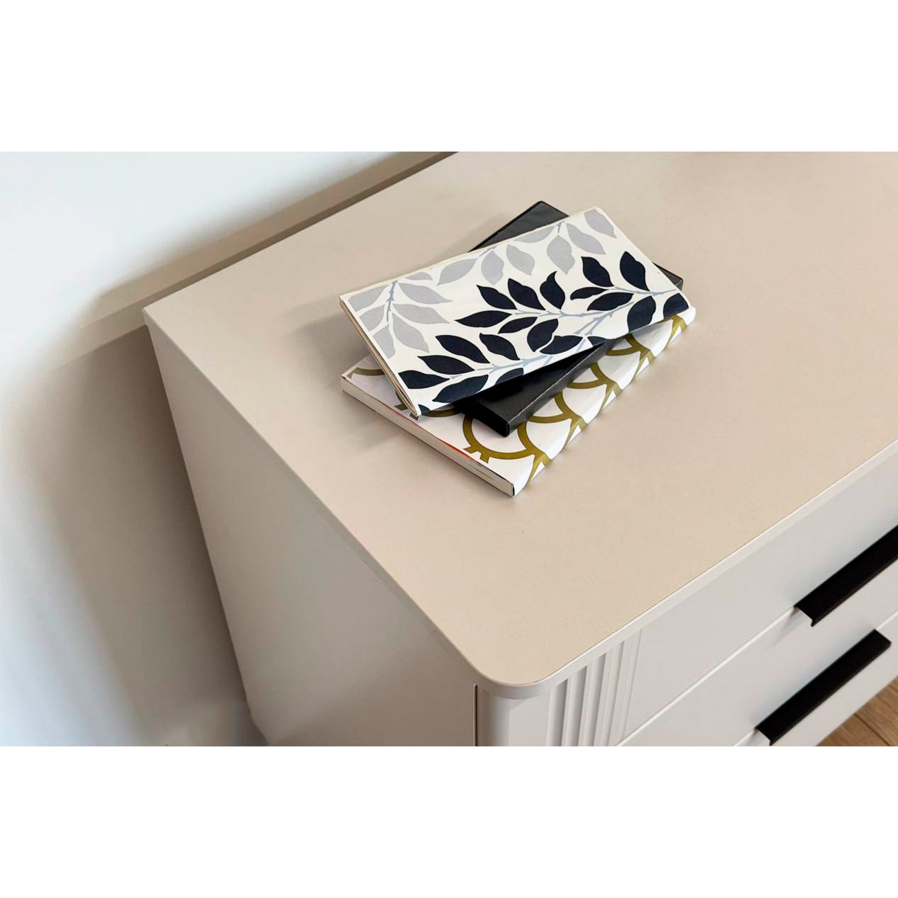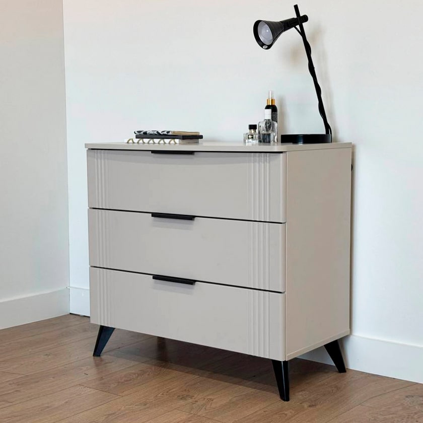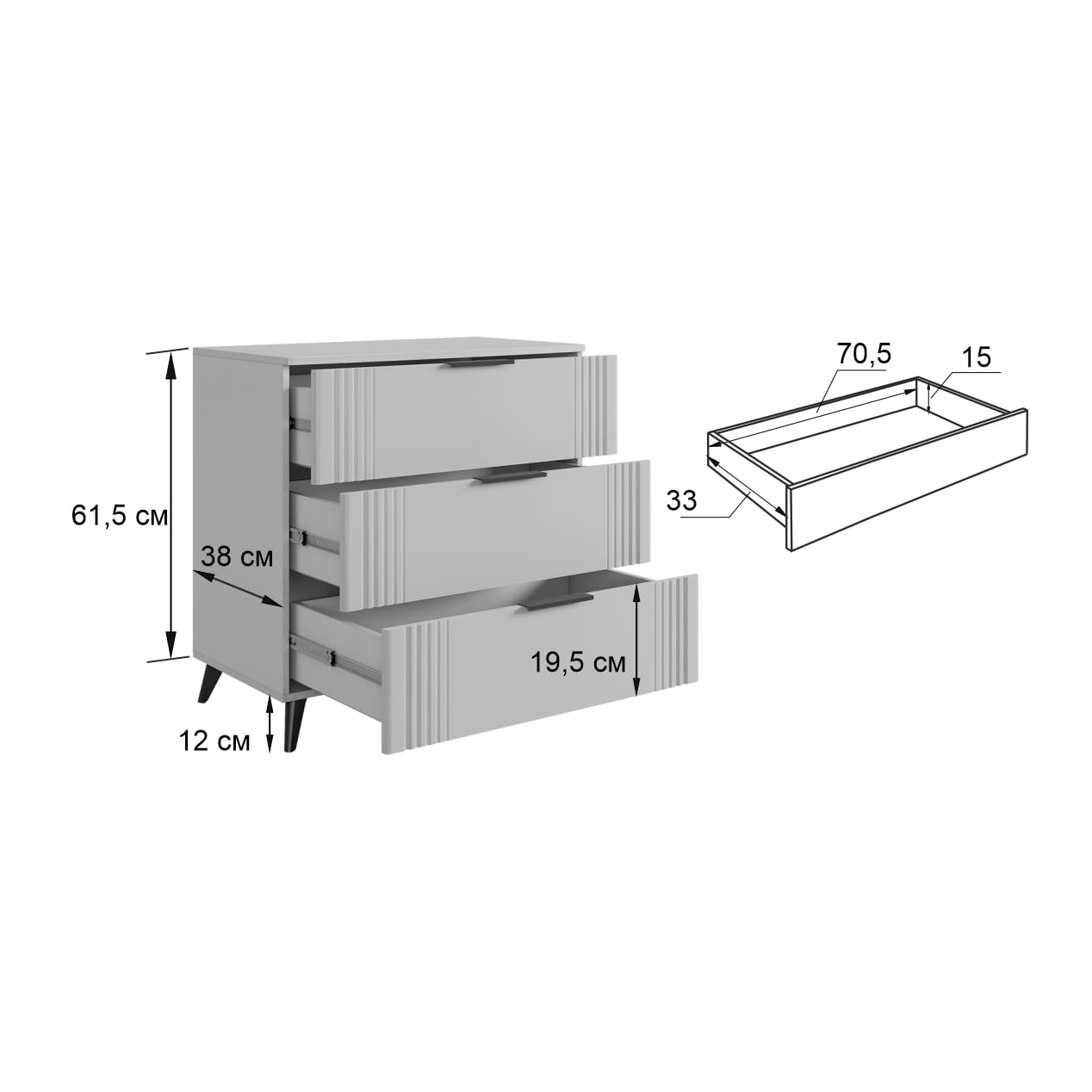 Комод изготовлен из качественных материалов: корпус выполнен из ЛДСП, что гарантирует прочность и долговечность, а фасад, выполненный из МДФ в плёнке ПВХ, не только выглядит эстетично, но и защищает комод от повреждений. Особое внимание заслуживает фрезеровка фасадов, которая придаёт изделию изысканный вид.
