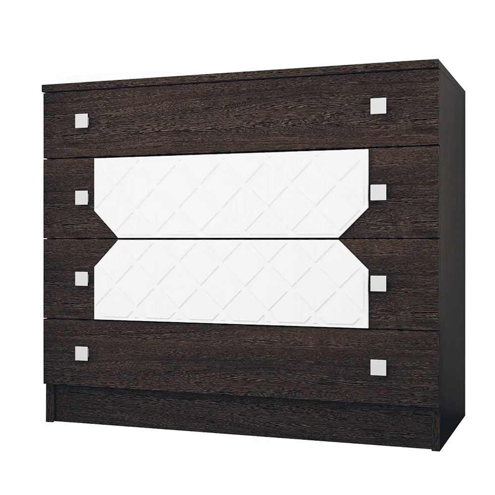 Комод оснащен четырьмя ящиками, что обеспечивает удобное хранение белья, одежды и других предметов. Тип направляющих - роликовые, что гарантирует плавное и бесшумное открывание и закрывание ящиков.