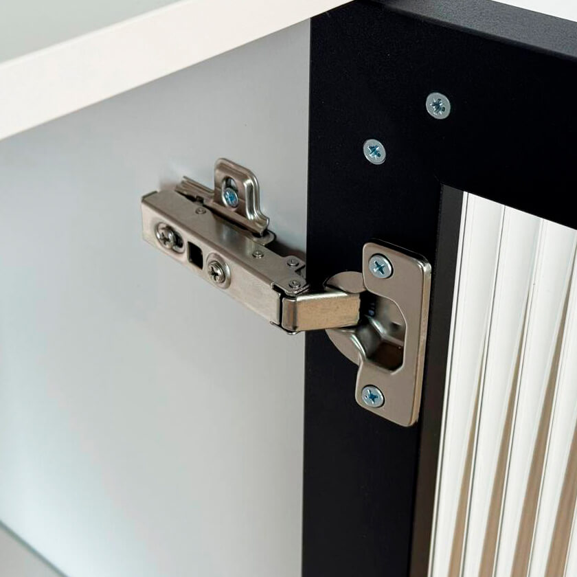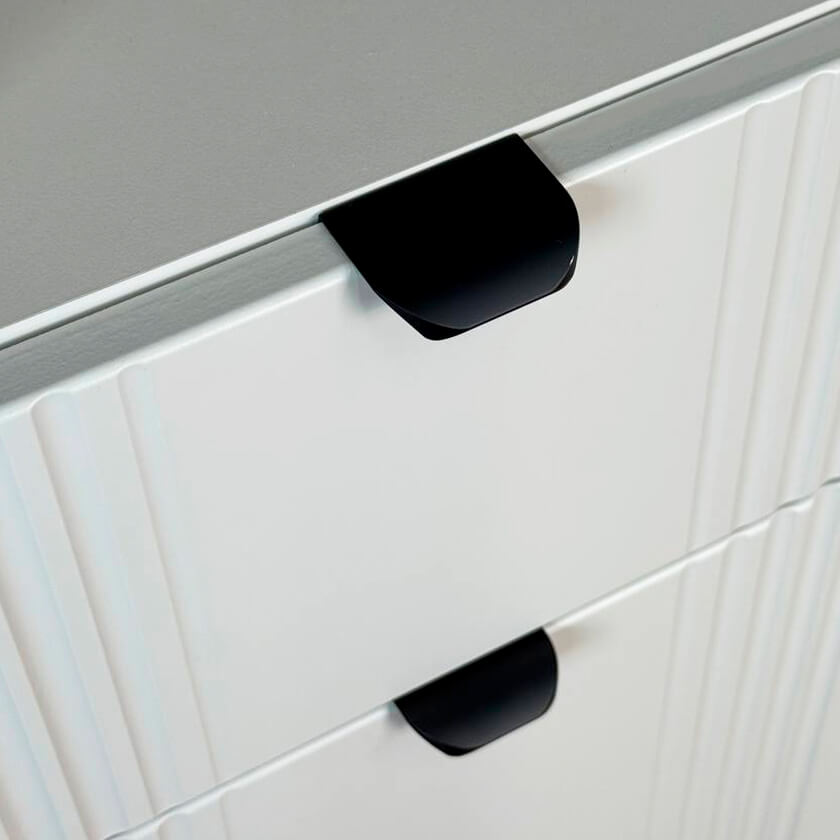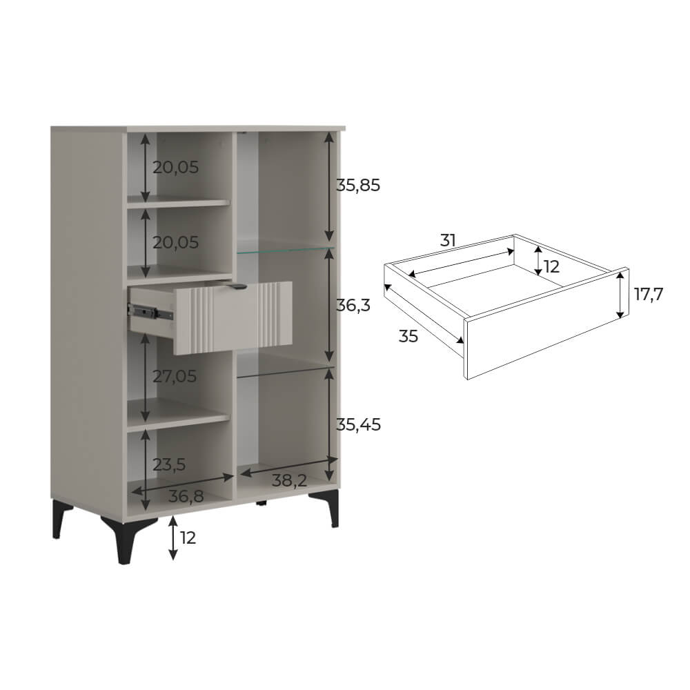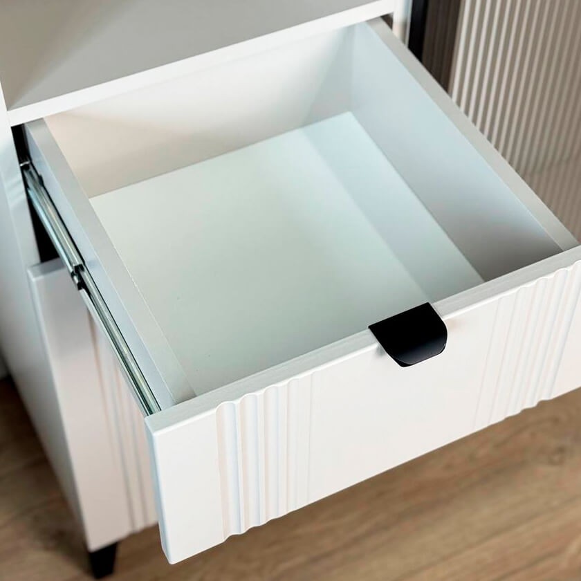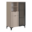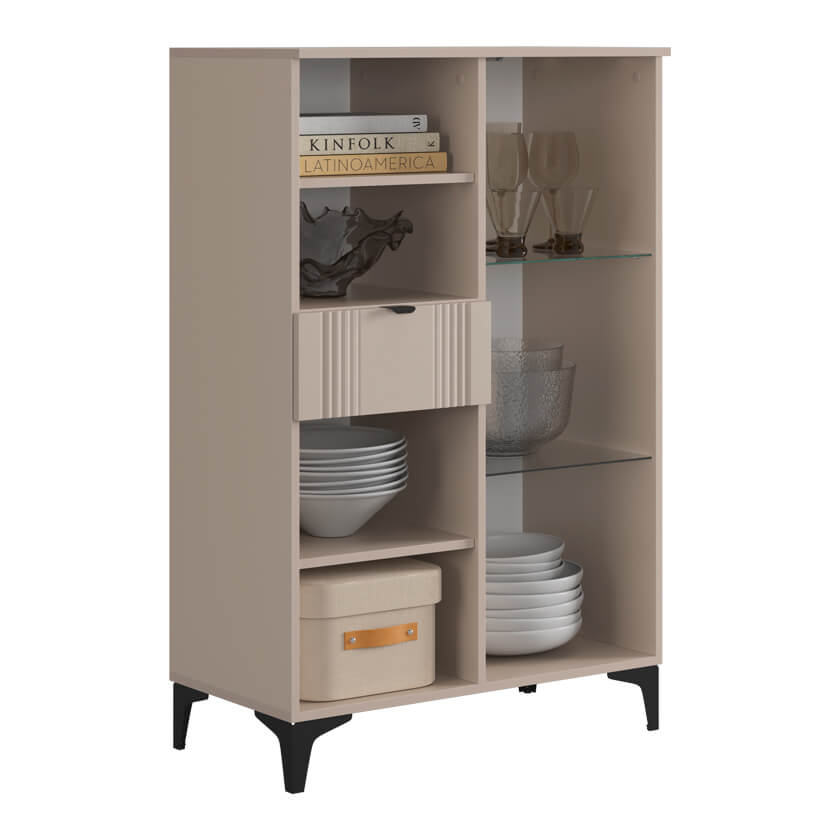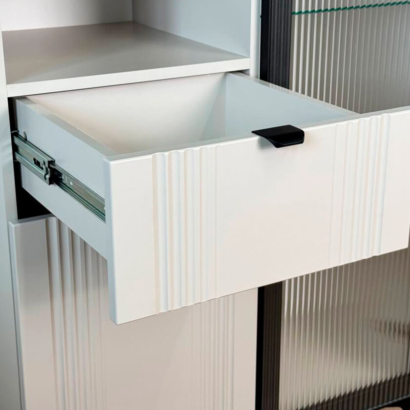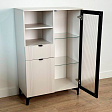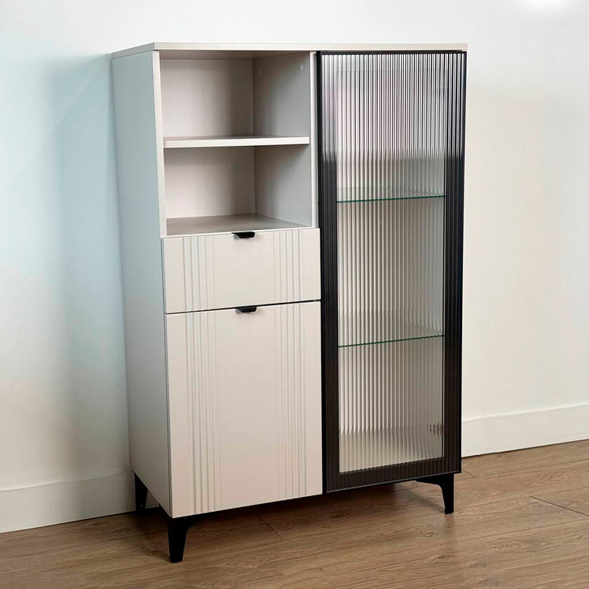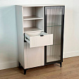 Дизайн комода продуман до мелочей: с одной стороны расположена стеклянная дверца, за которой находится просторное пространство для хранения. С другой стороны – ниша с открытой полкой, выкатной ящик и ещё одна глухая дверца, что позволяет гибко организовать хранение и поддерживать порядок в доме.