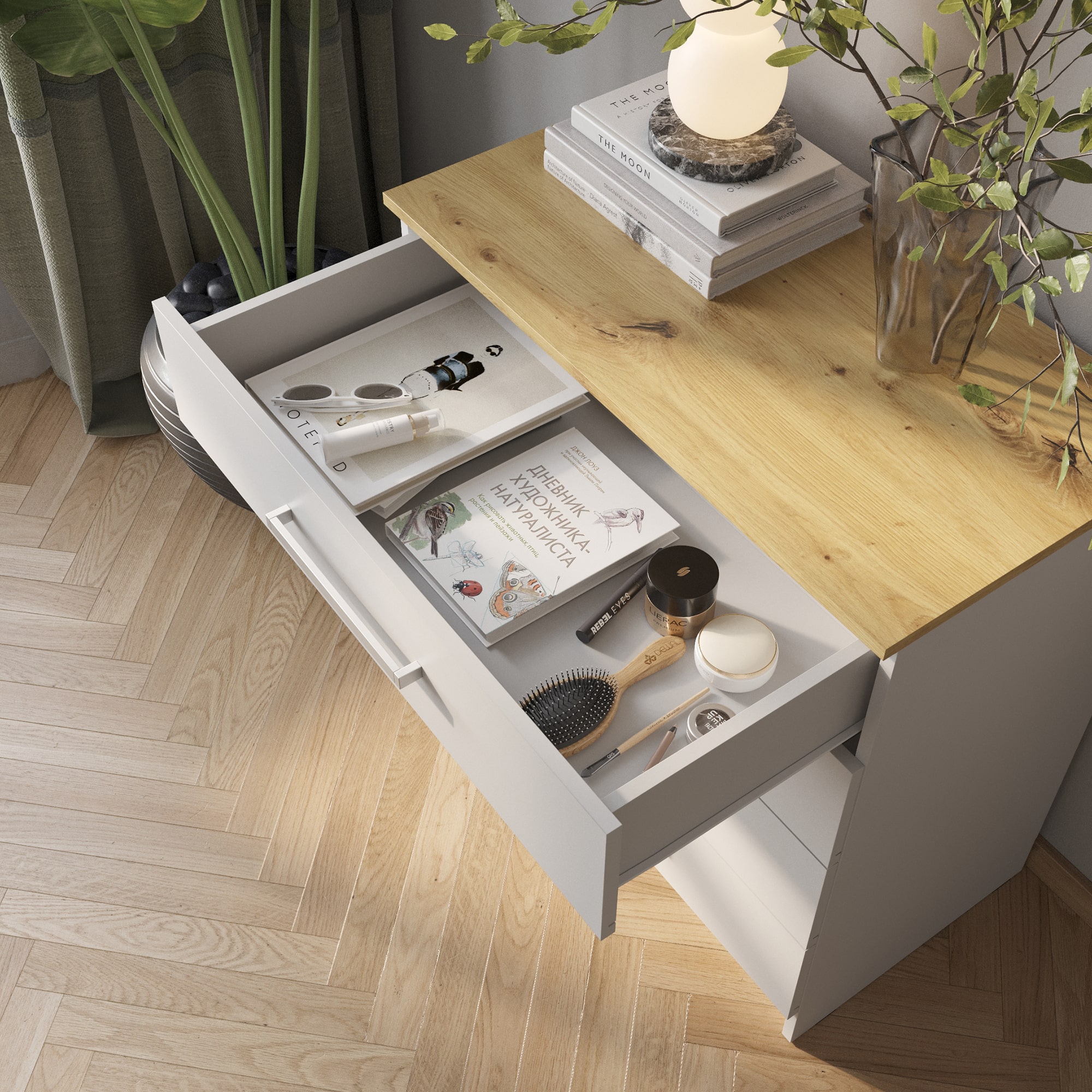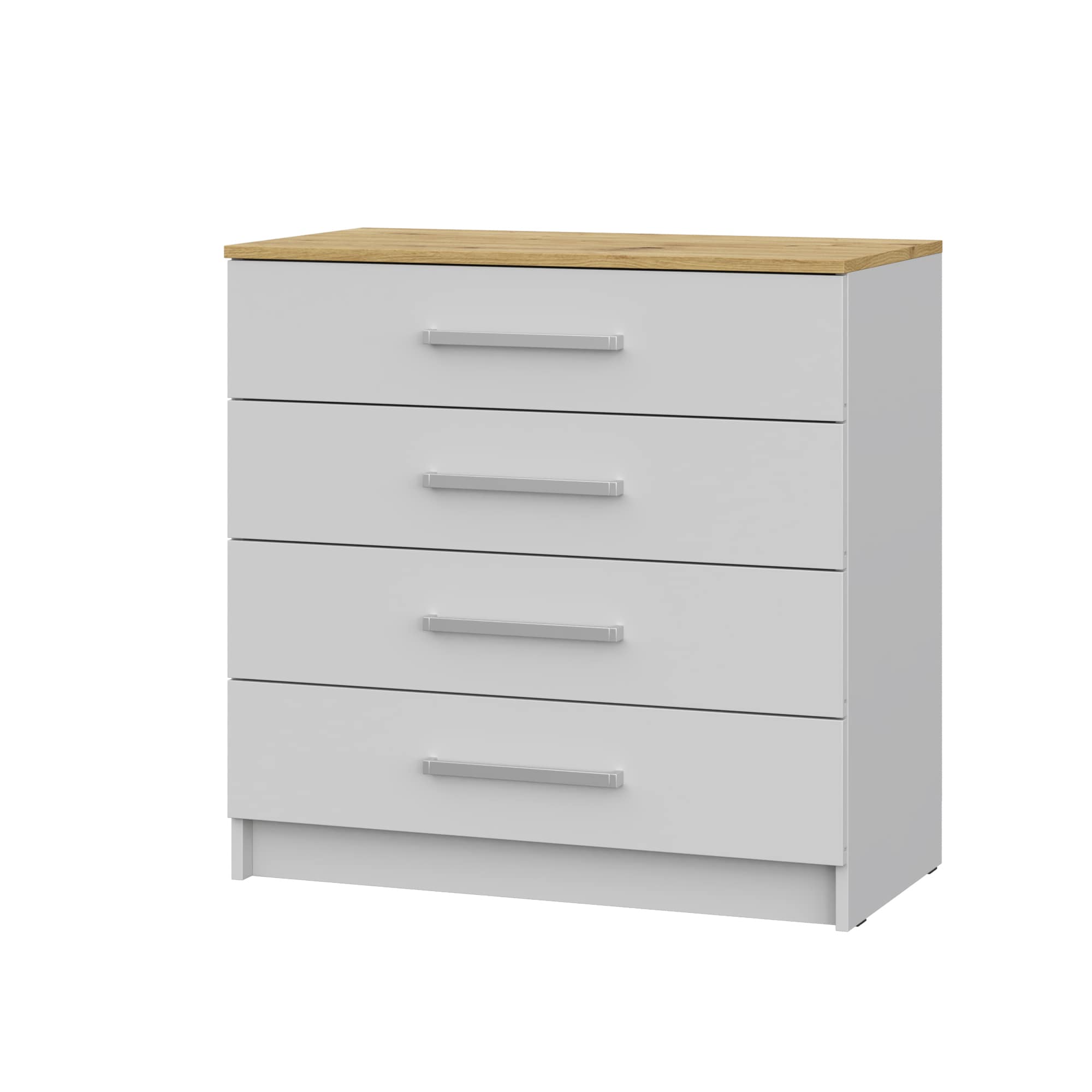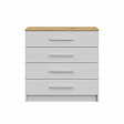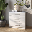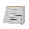 Комод оснащен четырьмя широкими выдвижными ящиками, что позволяет разместить в них большое количество одежды, постельного и нижнего белья. Благодаря роликовым направляющим ящики легко открываются и закрываются.