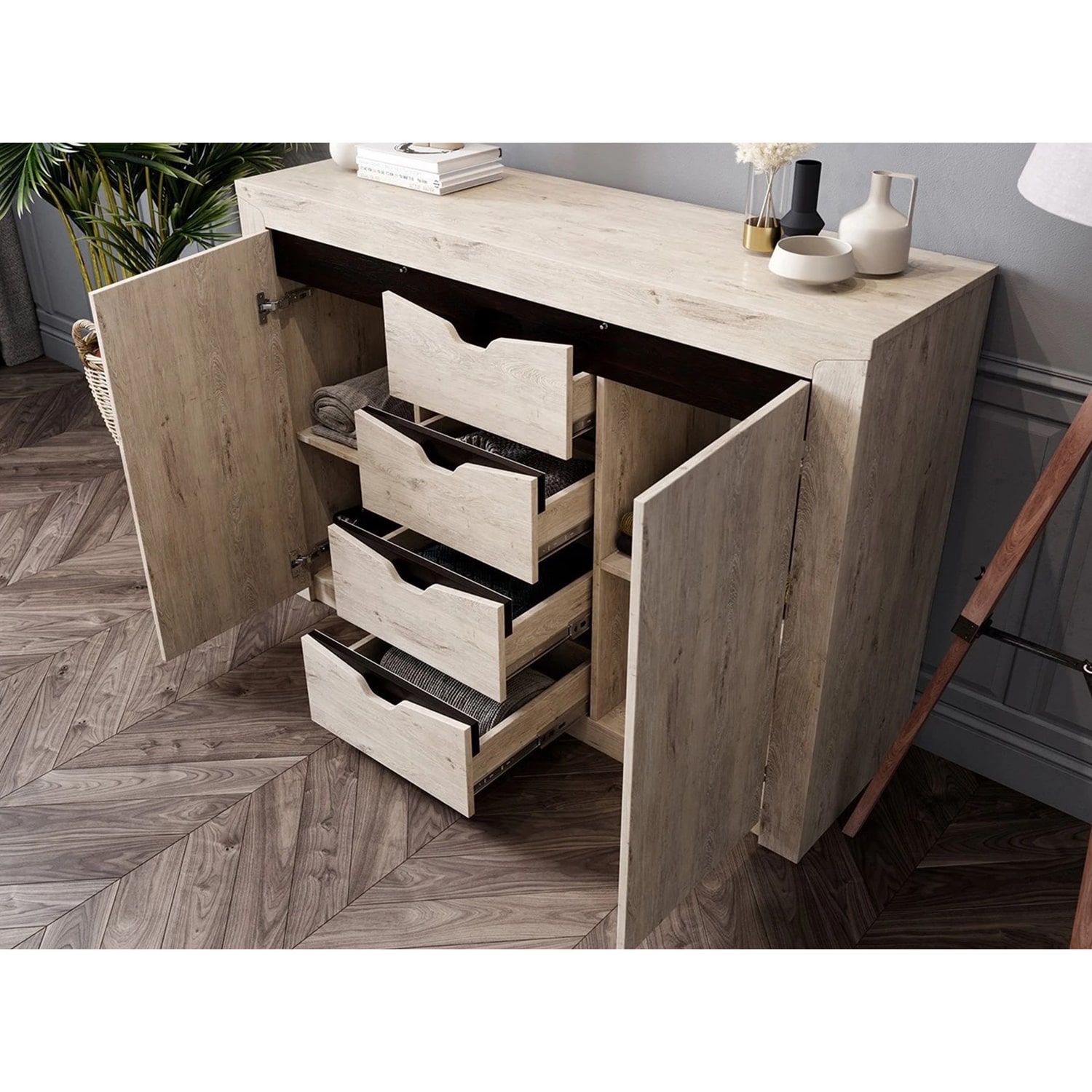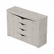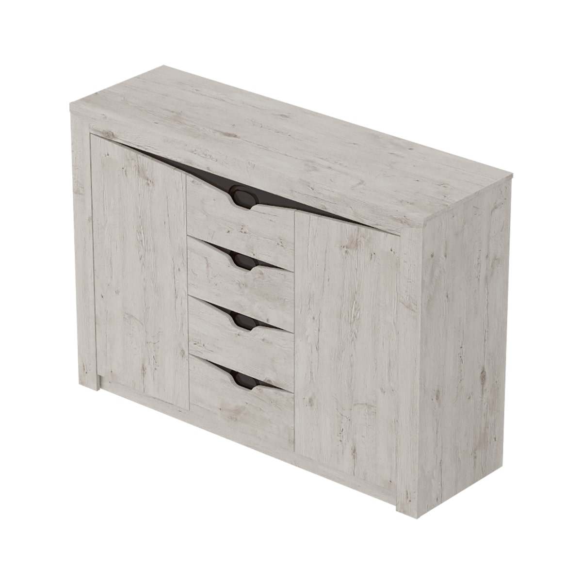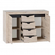 Комод "Соренто" имеет четыре выдвижных ящика, а также два вместительных отделения по бокам с полками и распашными дверями. На фасаде имеются декоративные вырезы, выполняющие функцию ручек.