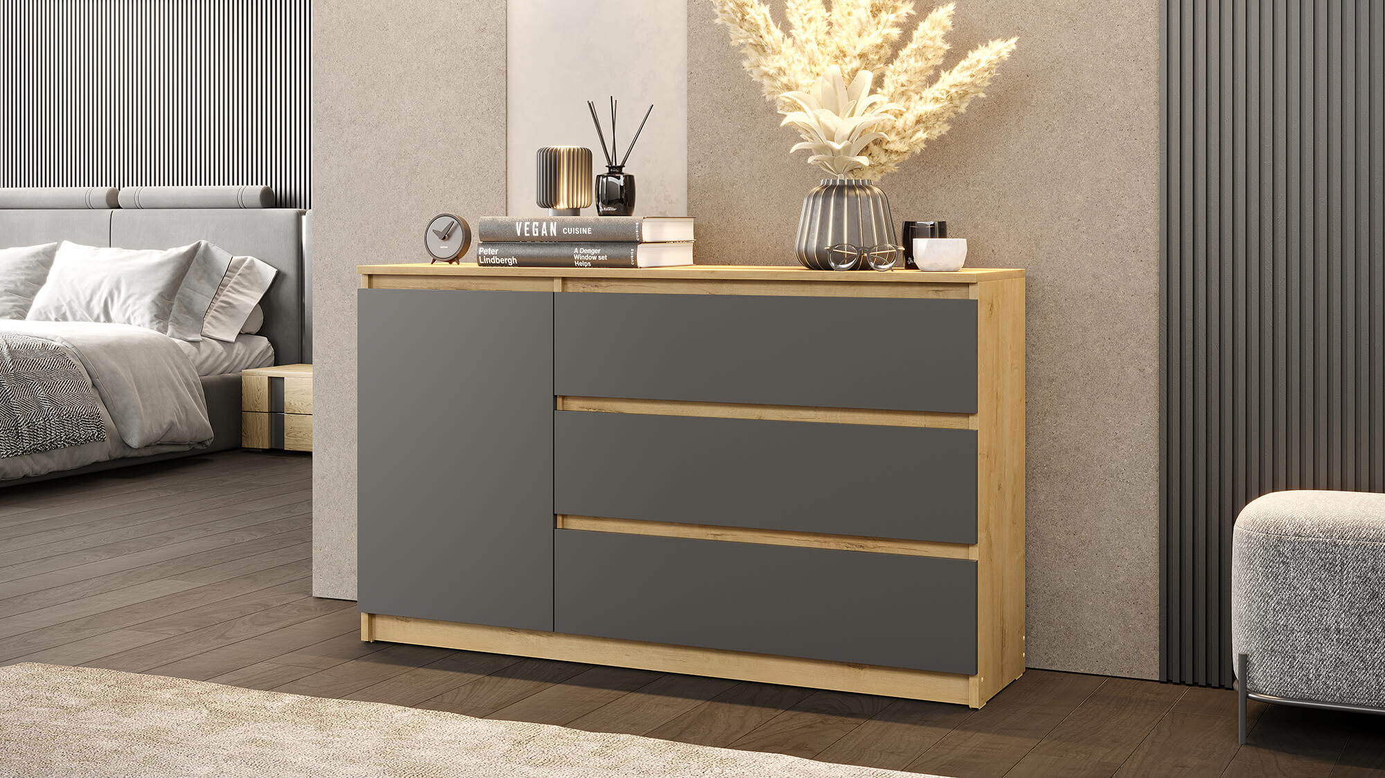 Комод «Вега» — стильное и практичное решение для организации пространства в вашем доме. Модель сочетает современный дизайн с продуманной функциональностью: вместительные ящики и отделение за дверцей позволяют аккуратно хранить одежду, постельное бельё или бытовые мелочи.
