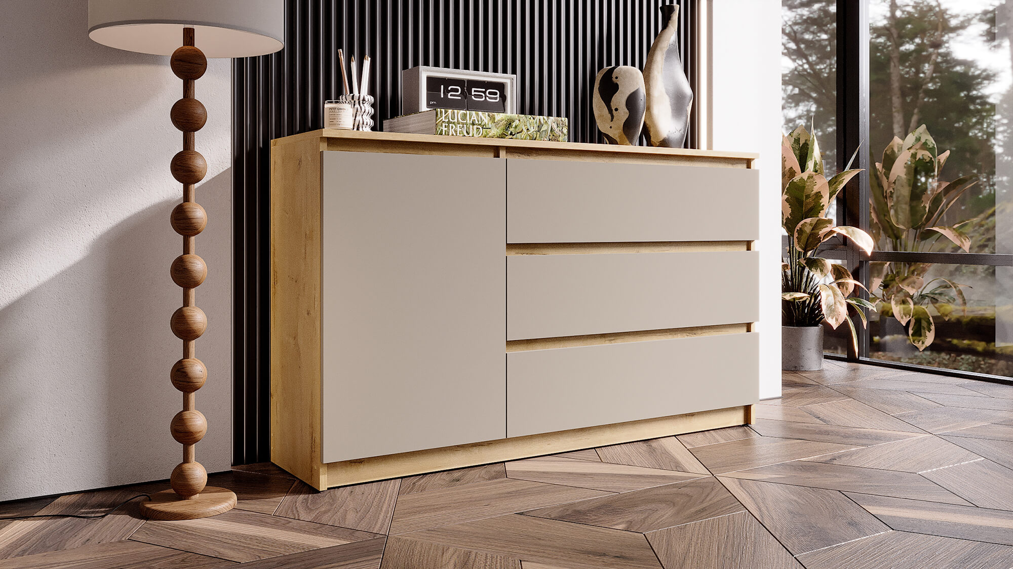 Комод «Вега» — стильное и практичное решение для организации пространства в вашем доме. Модель сочетает современный дизайн с продуманной функциональностью: вместительные ящики и отделение за дверцей позволяют аккуратно хранить одежду, постельное бельё или бытовые мелочи.