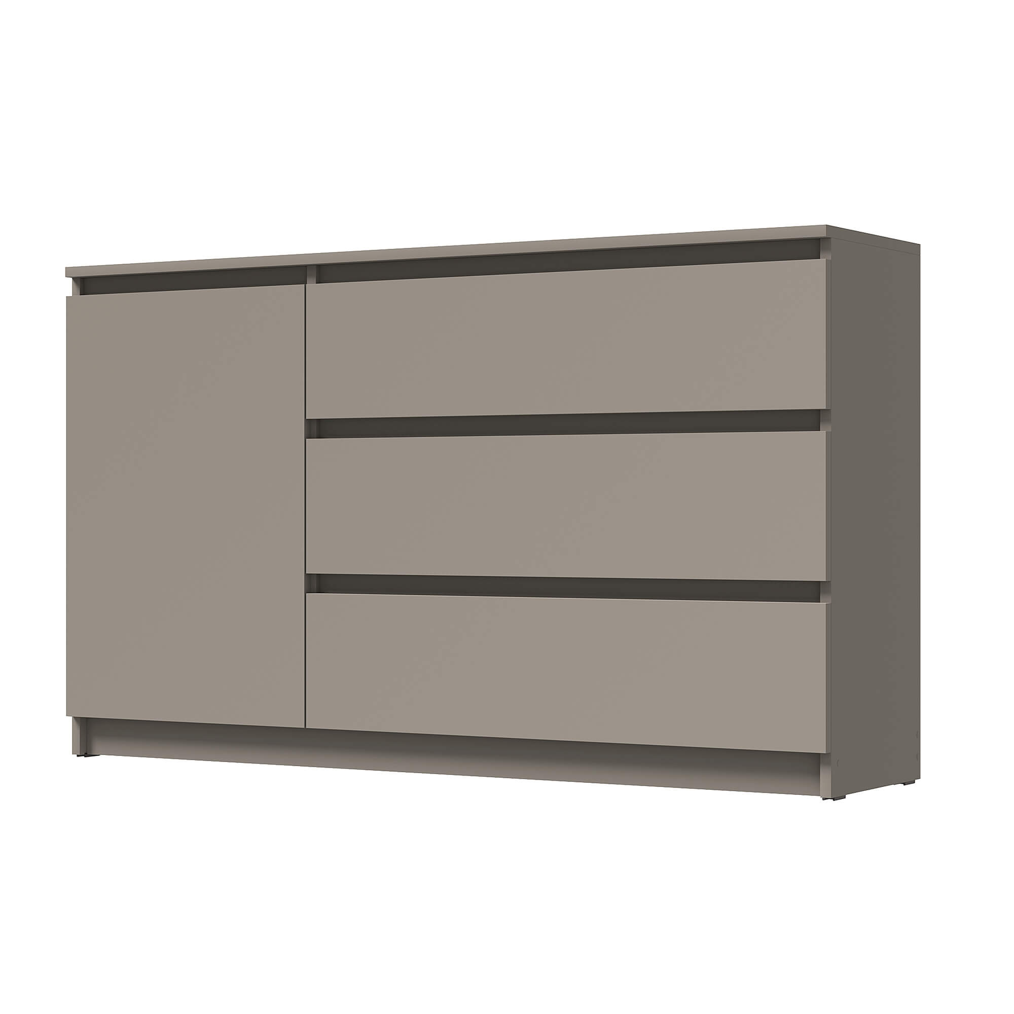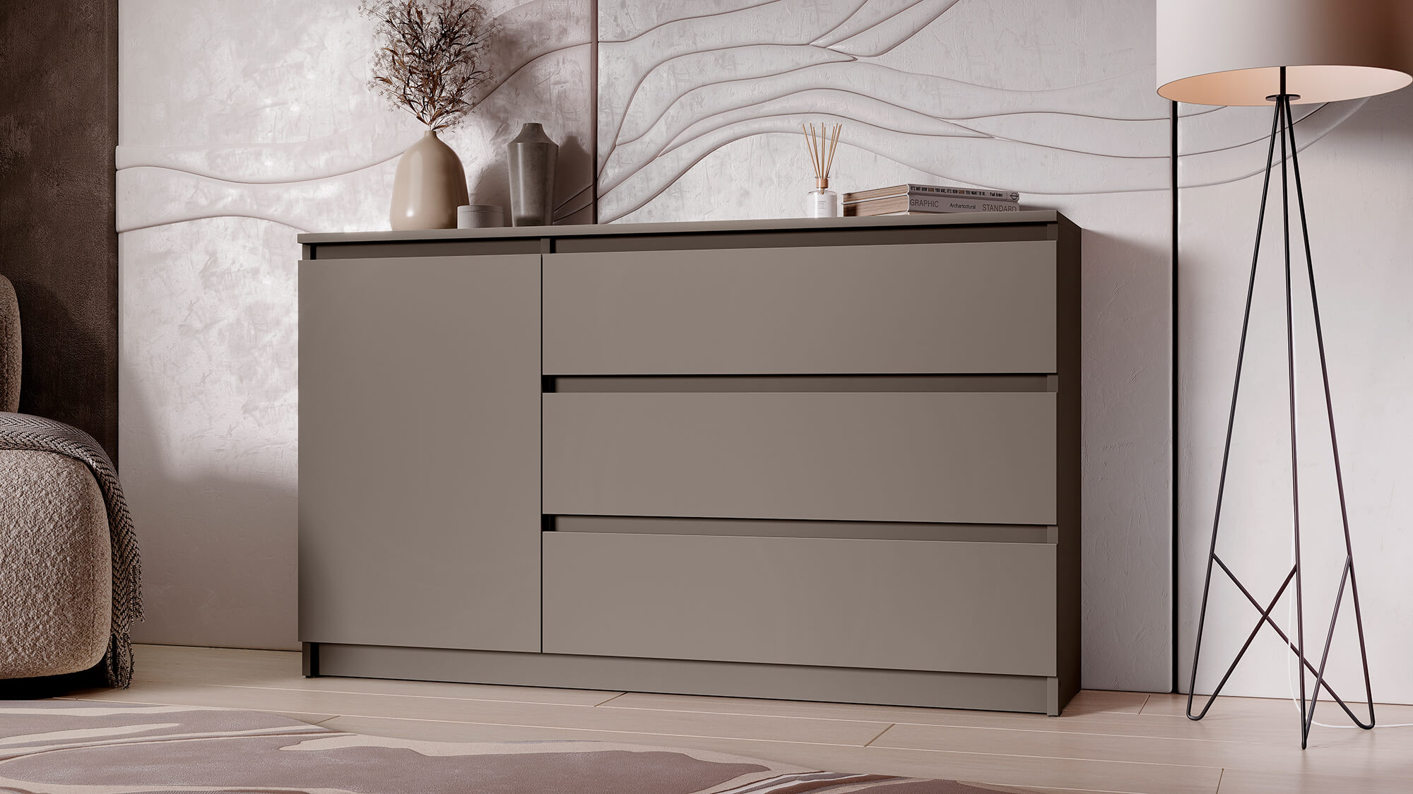 Комод «Вега» — стильное и практичное решение для организации пространства в вашем доме. Модель сочетает современный дизайн с продуманной функциональностью: вместительные ящики и отделение за дверцей позволяют аккуратно хранить одежду, постельное бельё или бытовые мелочи.