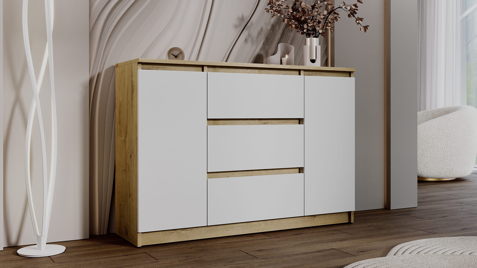 Комод «Вега» — стильное и практичное решение для организации пространства в вашем доме. Модель сочетает современный дизайн с продуманной функциональностью: вместительные ящики и отделение за дверцей позволяют аккуратно хранить одежду, постельное бельё или бытовые мелочи.