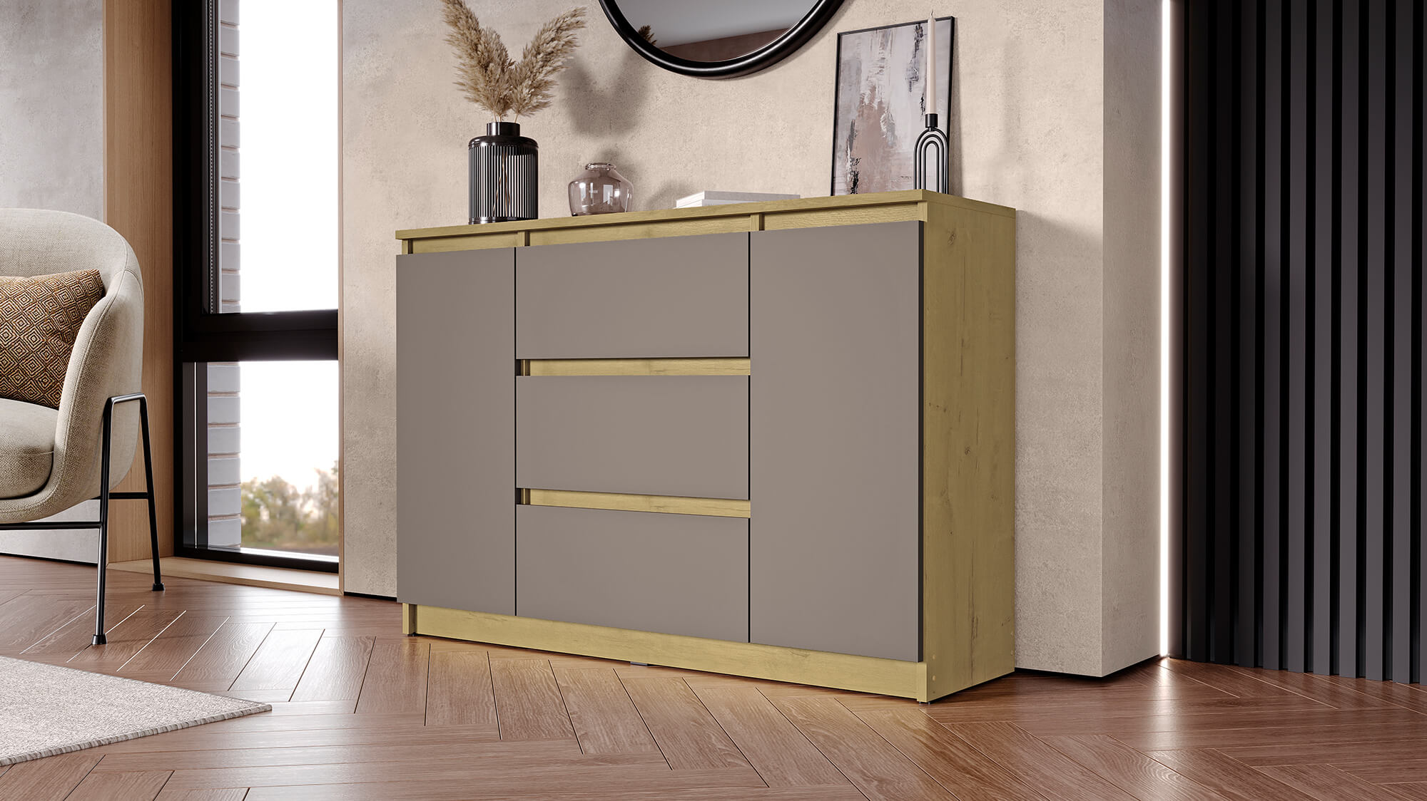 Комод «Вега» — стильное и практичное решение для организации пространства в вашем доме. Модель сочетает современный дизайн с продуманной функциональностью: вместительные ящики и отделение за дверцей позволяют аккуратно хранить одежду, постельное бельё или бытовые мелочи.