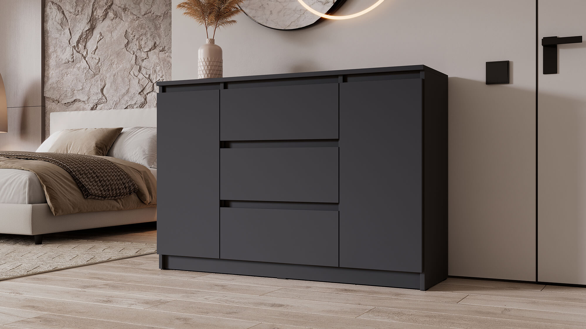 Комод «Вега» — стильное и практичное решение для организации пространства в вашем доме. Модель сочетает современный дизайн с продуманной функциональностью: вместительные ящики и отделение за дверцей позволяют аккуратно хранить одежду, постельное бельё или бытовые мелочи.