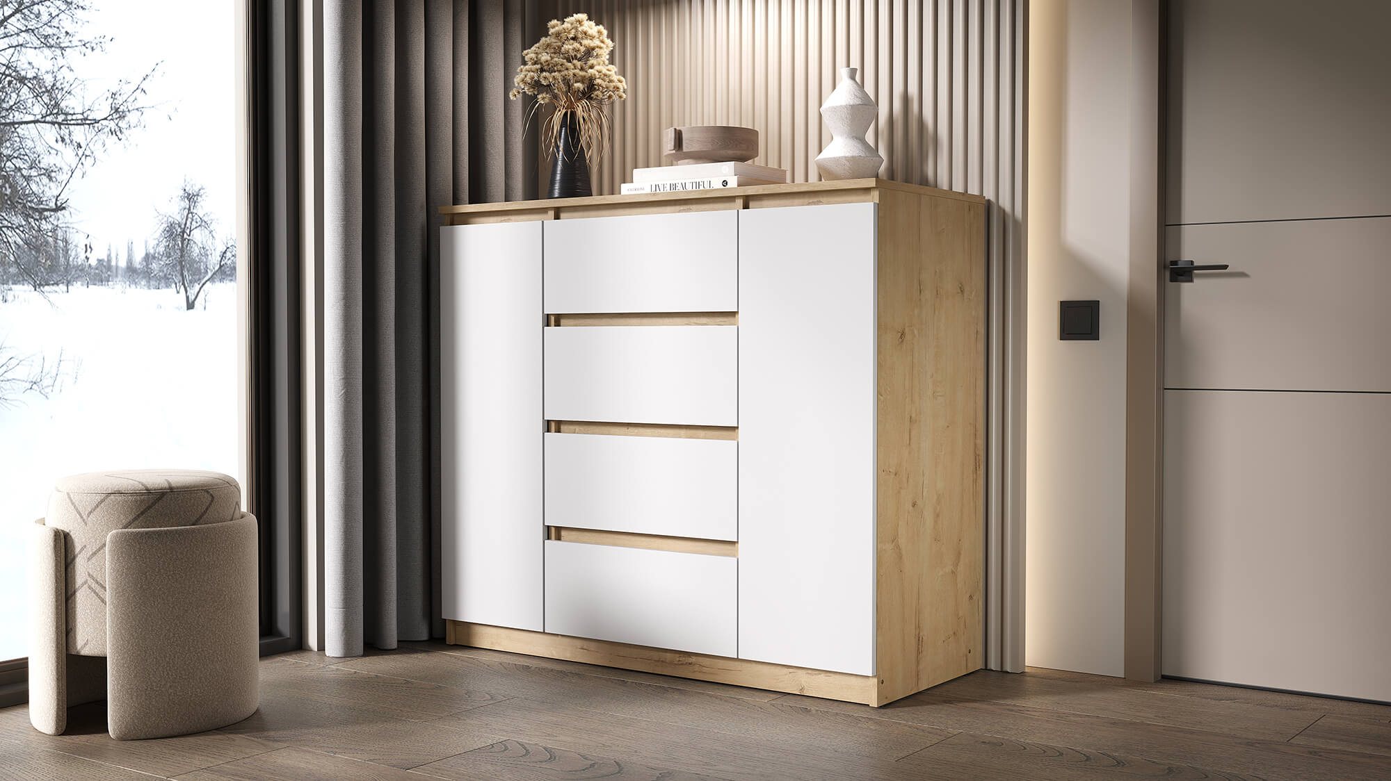 Благодаря лаконичному внешнему виду комод органично впишется в интерьер спальни, гостиной или прихожей. Прочные материалы и надёжная фурнитура гарантируют долгий срок службы, а чёткие линии и стильная цветовая гамма подчеркнут эстетику вашего дома.