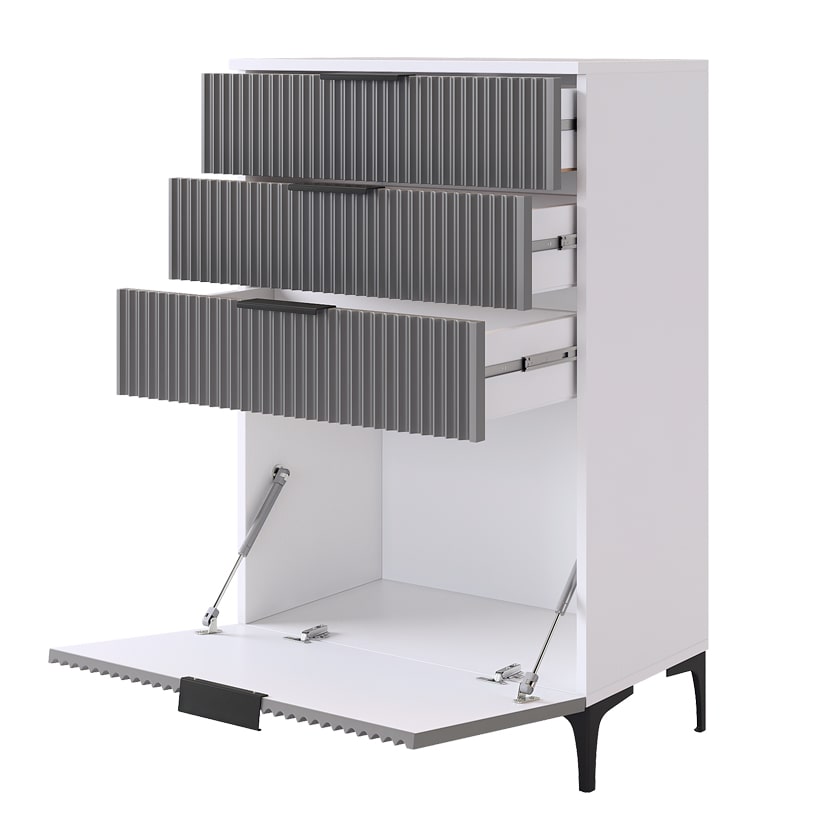 Комод «Зефир» — идеальное решение для детской и гостиной комнат. Он оснащён выкатными ящиками и откидной секцией, обеспечивая максимальный комфорт и удобство использования. Фасады украшены изящной фрезеровкой, которая придаёт изделию неповторимый шарм и элегантность.