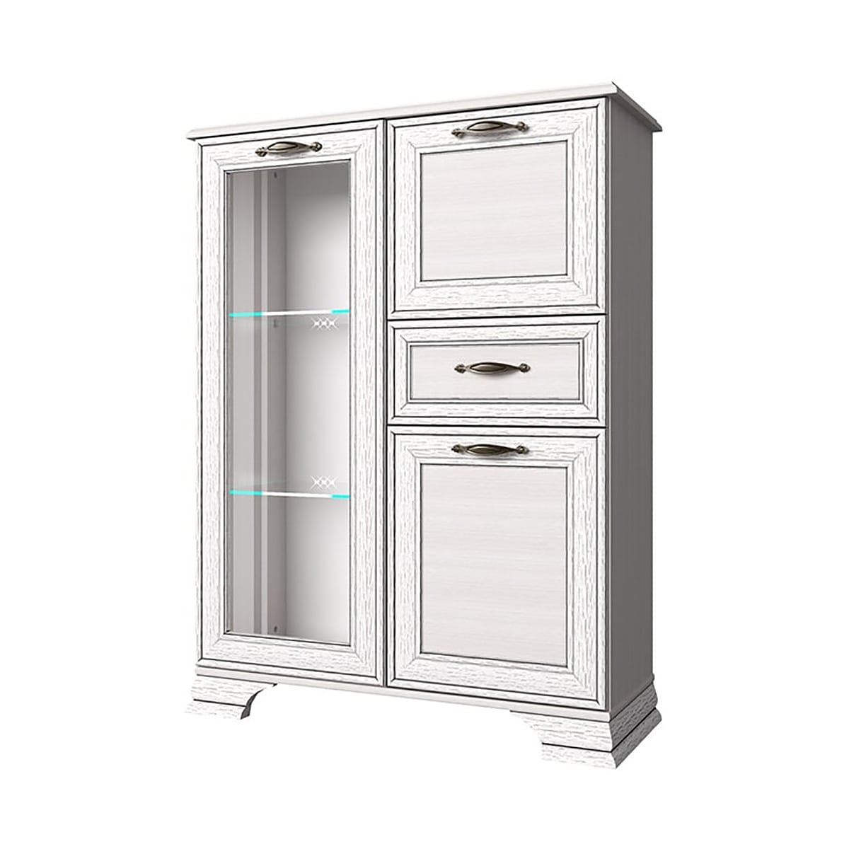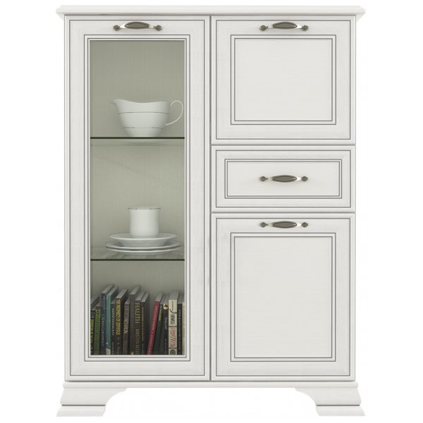 Тумба Тиффани 1V2D1S, такой элемент подходит для оформления интерьера в классическом стиле гостиной, столовой, кабинета. Тумба 1V2D1S – прямая. Конструкция элемента представляет собой две вместительные ниши с откидной дверью и распашной (2D – двери глухие), одно отделение с полками из закалённого стекла за витриной (1V – закалённое стекло) для хранения посуды, предметов декора и других вещей; и один выдвижной ящик (1S) для хранения предметов быта, салфеток.