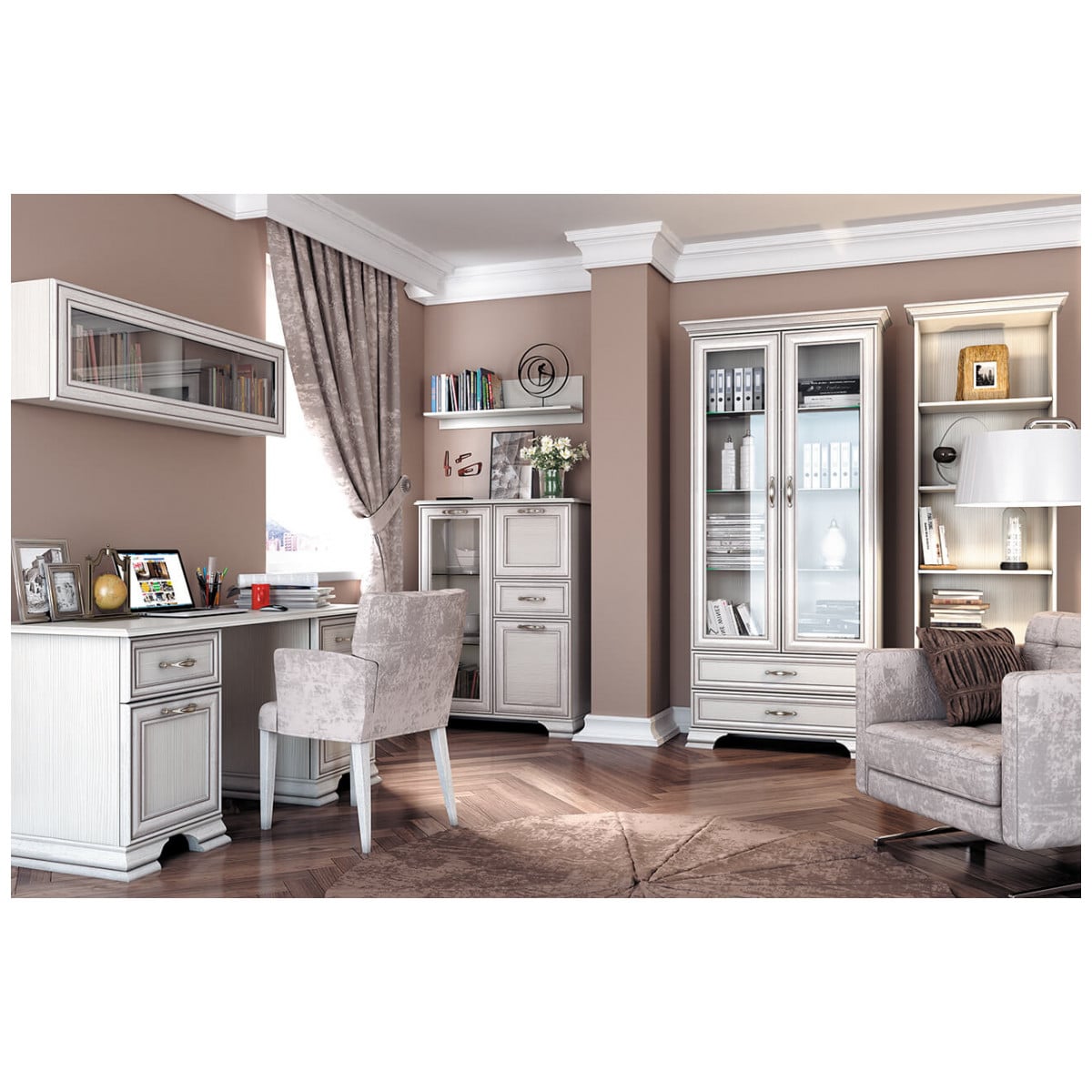 -рамочно-филенчатые фасады (патинированная планка из МДФ, филенка - ЛДСП), витрина – закалённое стекло (4 мм);